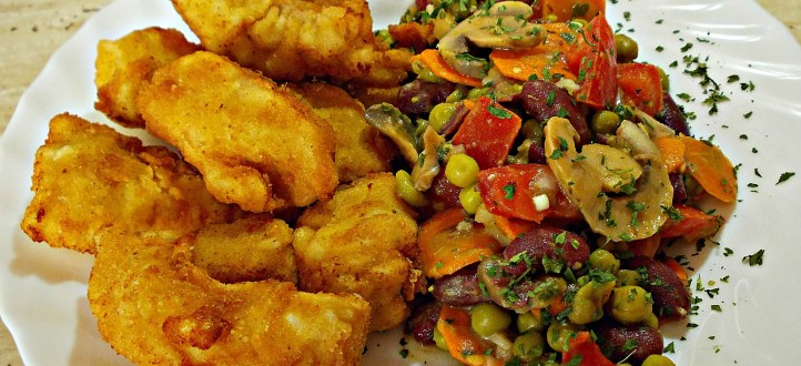 Főétel A: Rántott csirkemell falatok zöldségsalátával