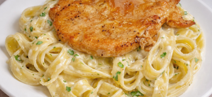 Főétel B: Sertésszelet sajtos, tejszínes tésztával