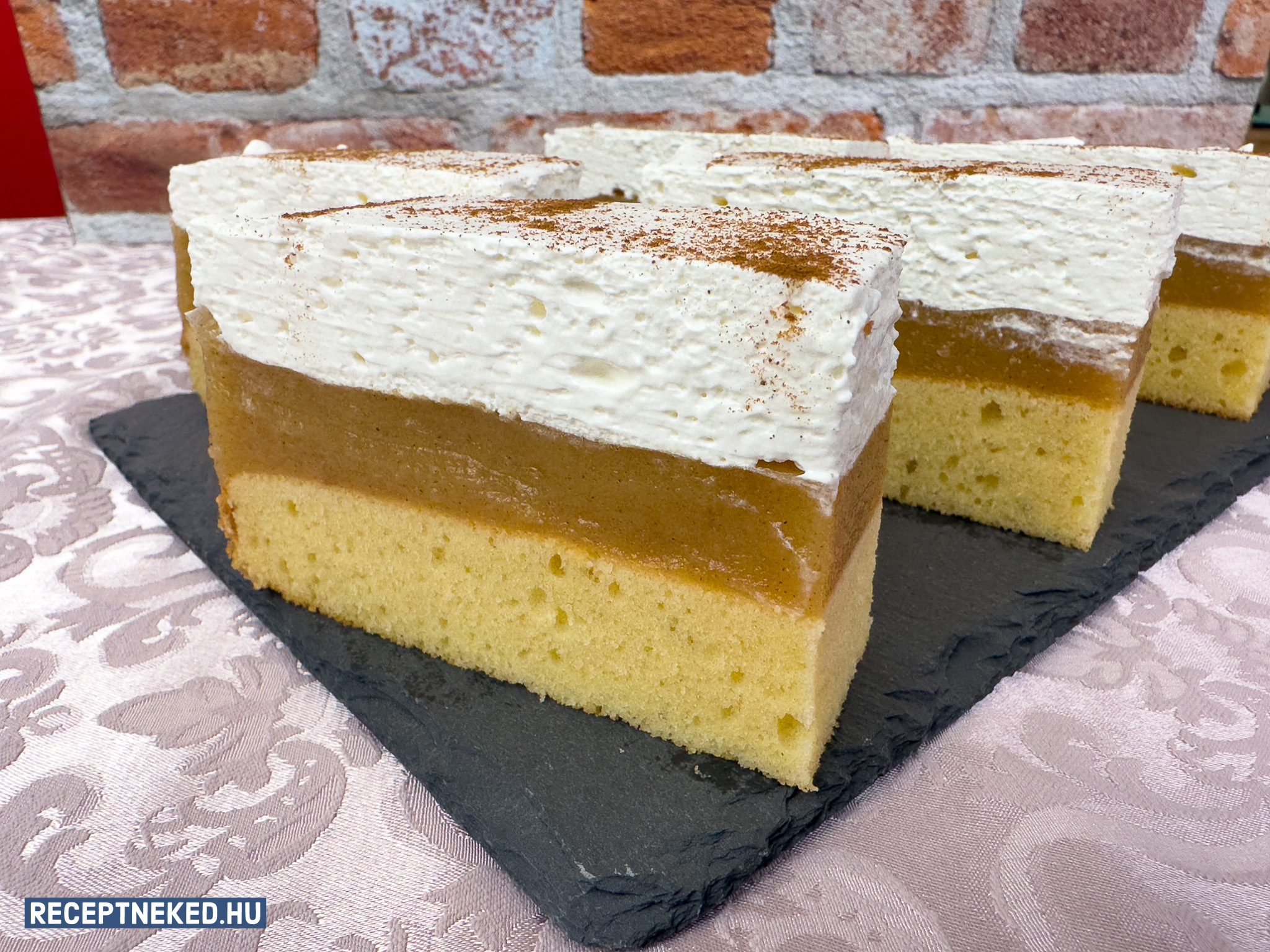 A behűtött habtejszínt a porcukorral keményre felverjük. A kész habot az almás rétegre simítjuk. Hagyhatjuk a tetejét rusztikusra, de el is simíthatjuk teljesen.
