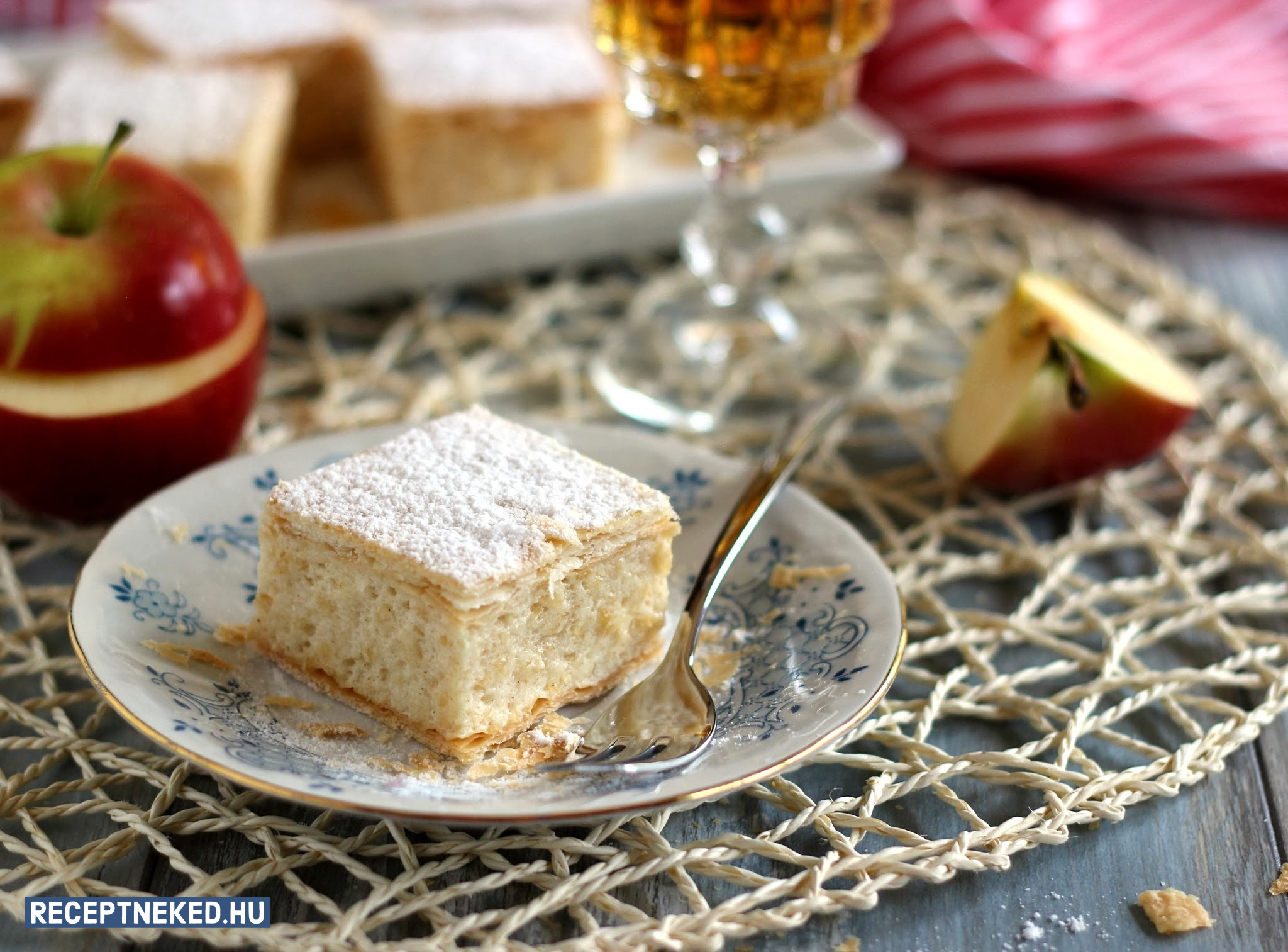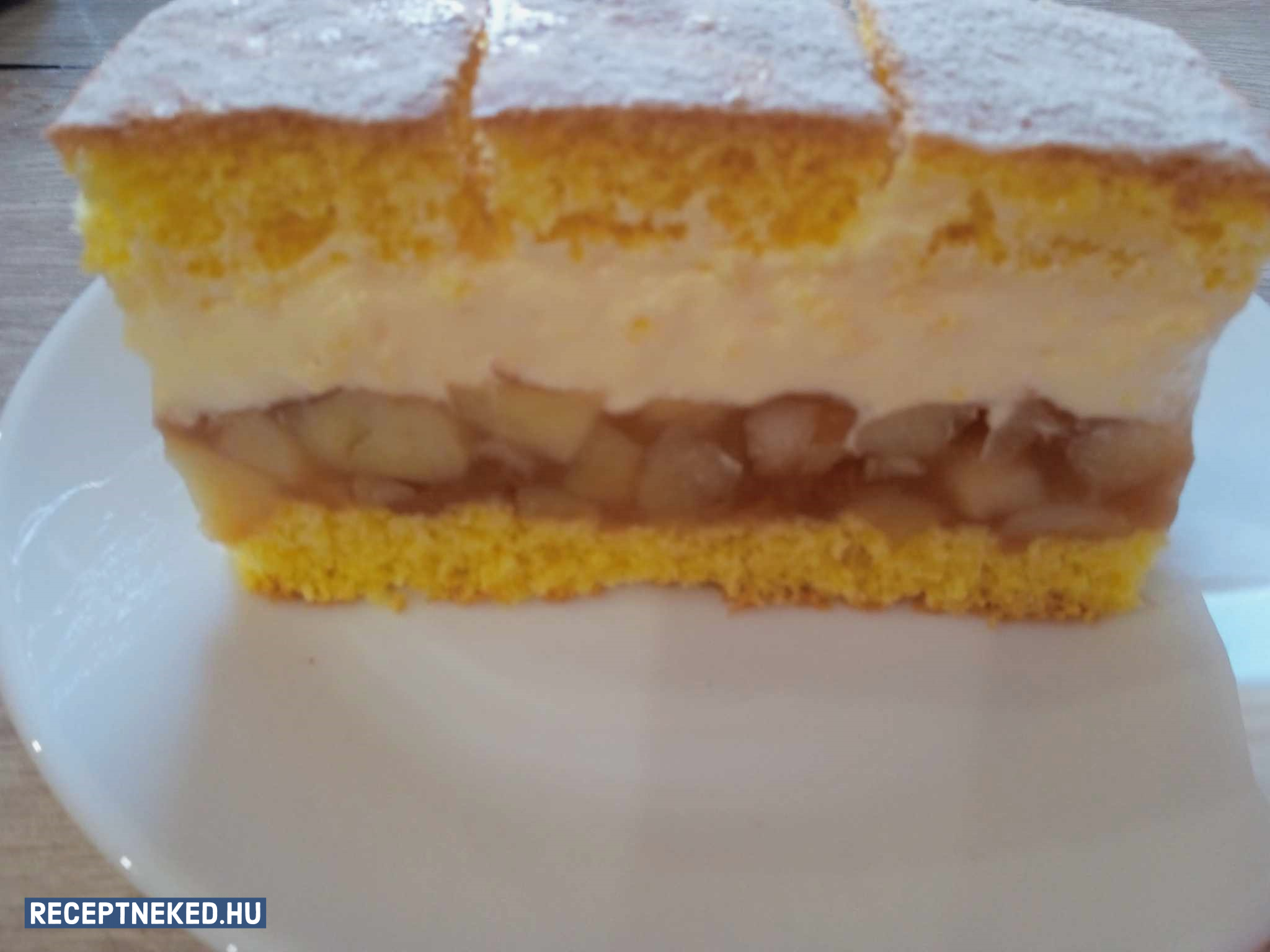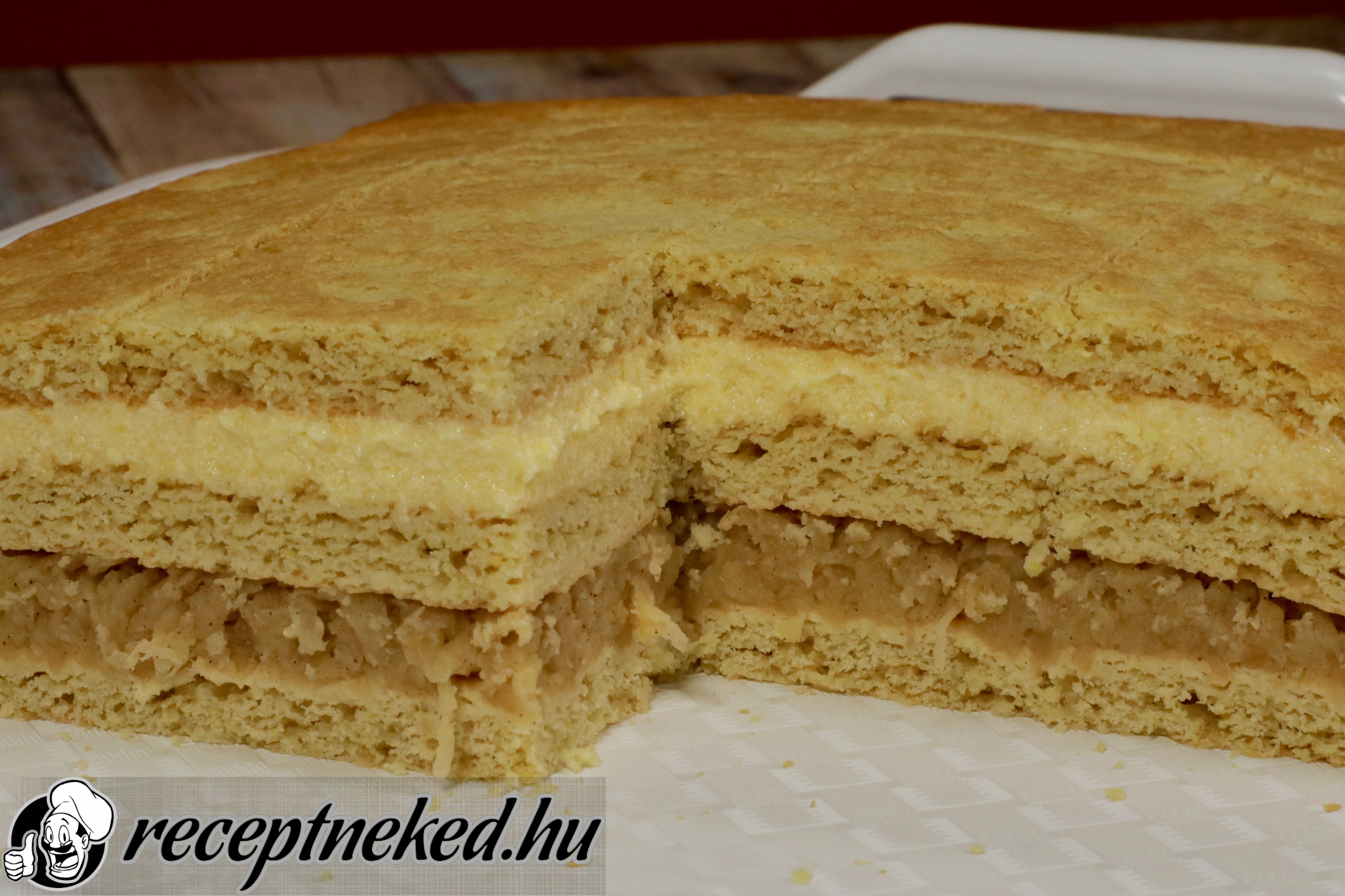 A kihűlt piskótát félbe vágjuk. Az egyik fél piskótára rákenjük az almás tölteléket, majd ráhelyezzük a másik fél piskótát. Végezetül a sütemény tetejére kenjük a vanília krémet.