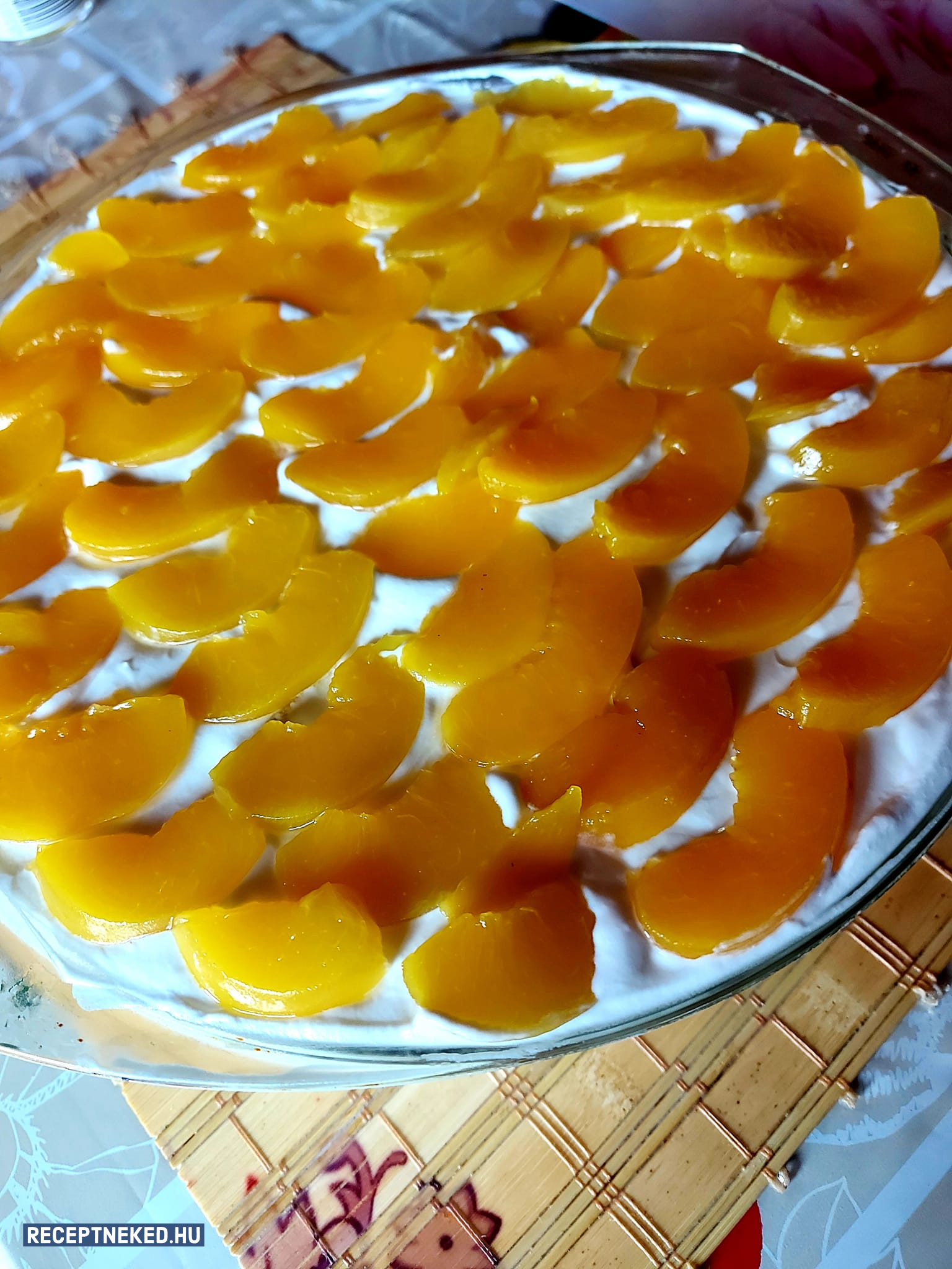 A jól eldolgozott masszát nagyobb méretű (kb30x30), négyzet alakú tepsibe öntjük és előmelegített sütőbe helyezzük. (kb160-180 fok)Ameddig a tészta sül, elkészítjük a krémet és a tölteléket.