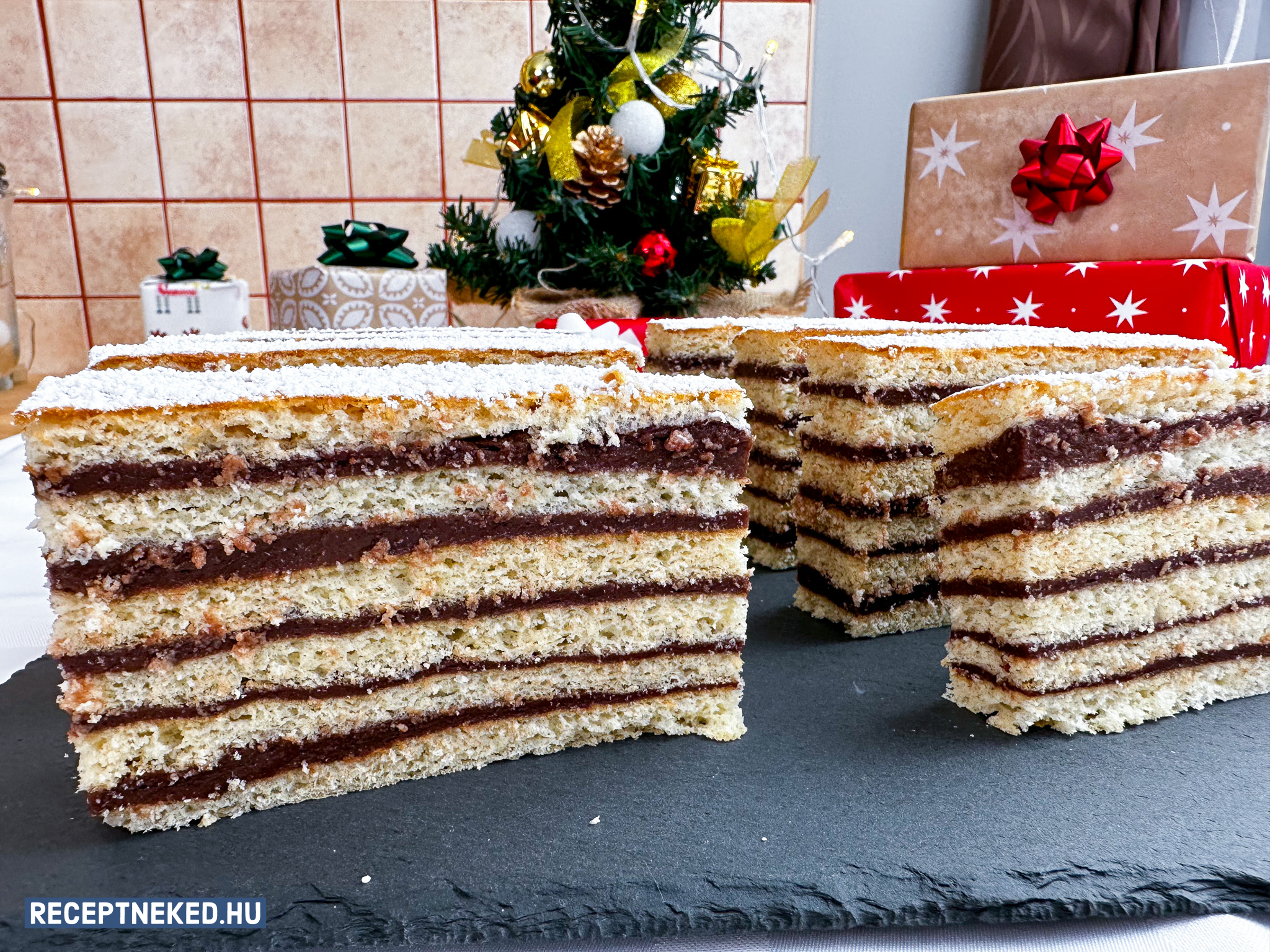 Amikor a tészta kihűlt, rákentem a csokis krémet, és hűtőbe tettem, néhány órát hagytam dermedni, felszeleteltem, majd a vaníliás cukorral keményre vert tejszínhabbal díszítettem.