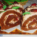 A piskótához a tojásokat a cukorral alaposan kihabosítjuk, hogy könnyű, levegős masszát kapjunk. Ezután spatulával apránként hozzákeverjük az átszitált kakaós lisztet, ügyelve, hogy ne törjük össze a habot. A masszát egy szilikonos sütőpapírral bélelt tepsire egyengetjük, és 180 fokra előmelegített sütőben kb. 30 perc alatt készre sütjük. A még meleg piskótát feltekerjük, és így hagyjuk kihűlni, hogy később könnyen formázható legyen.