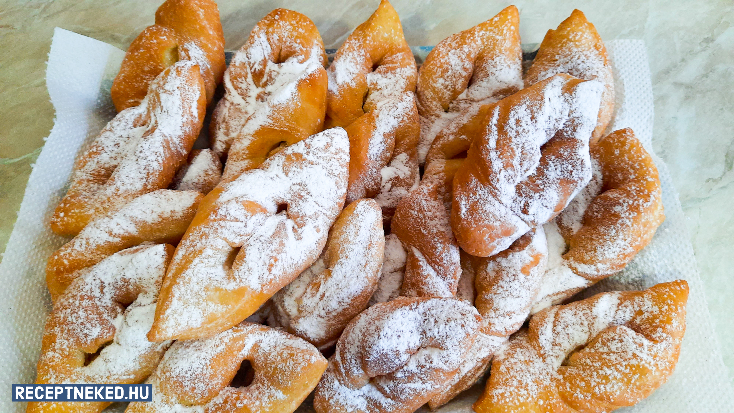 Ezután derelyevágóval (v. késsel) vágjuk fel rombusz alakúra a kinyújtott tésztát, és ejtsünk a közepén egy hosszanti bemetszést, majd a tészta egyik sarkát húzzuk át rajta.