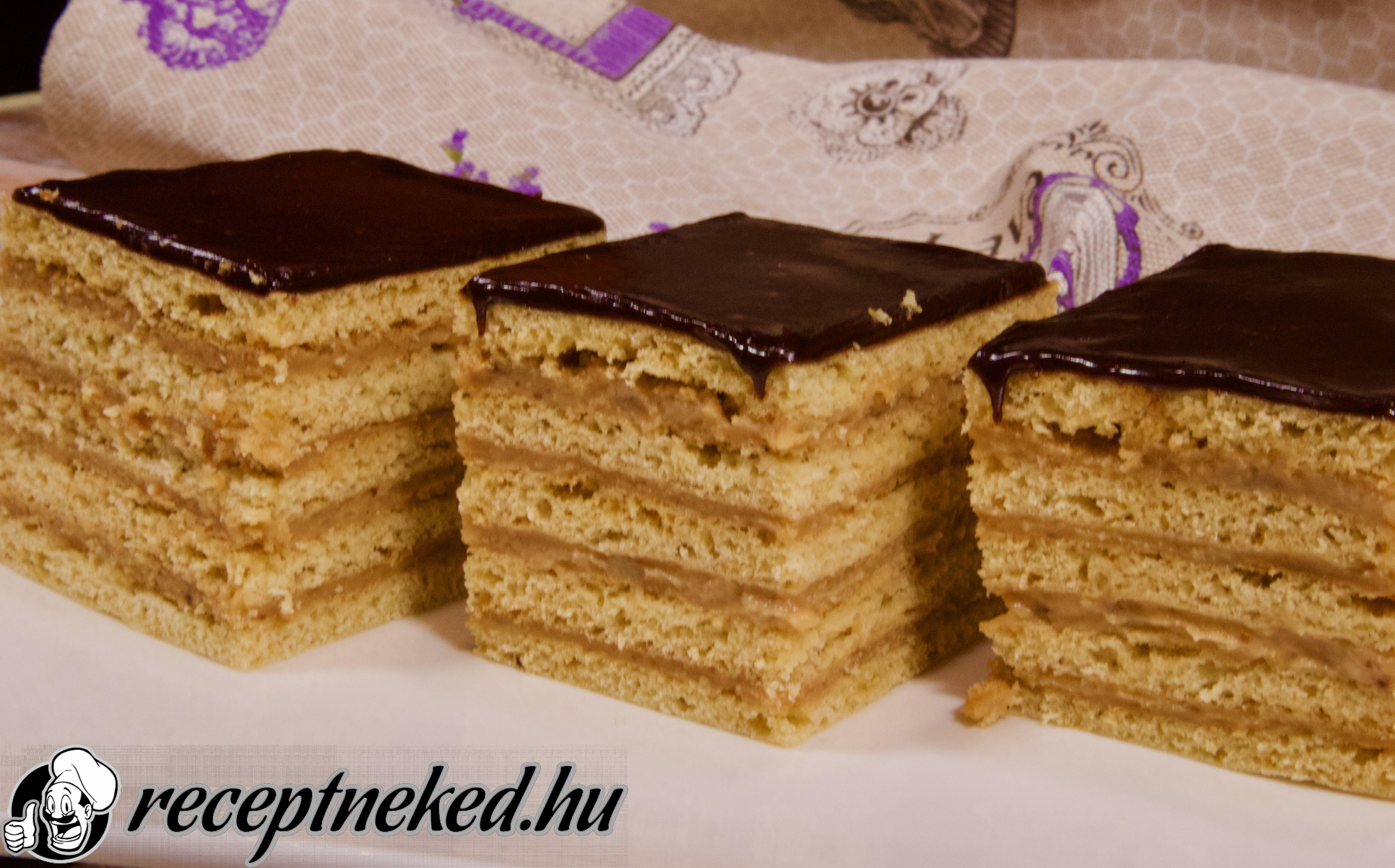 Összeállítás: lap, karamell krém fele, erre kenjük a sárga krém felét, majd újabb piskóta, karamell krém és sárga krém, majd a harmadik lappal befedjük.