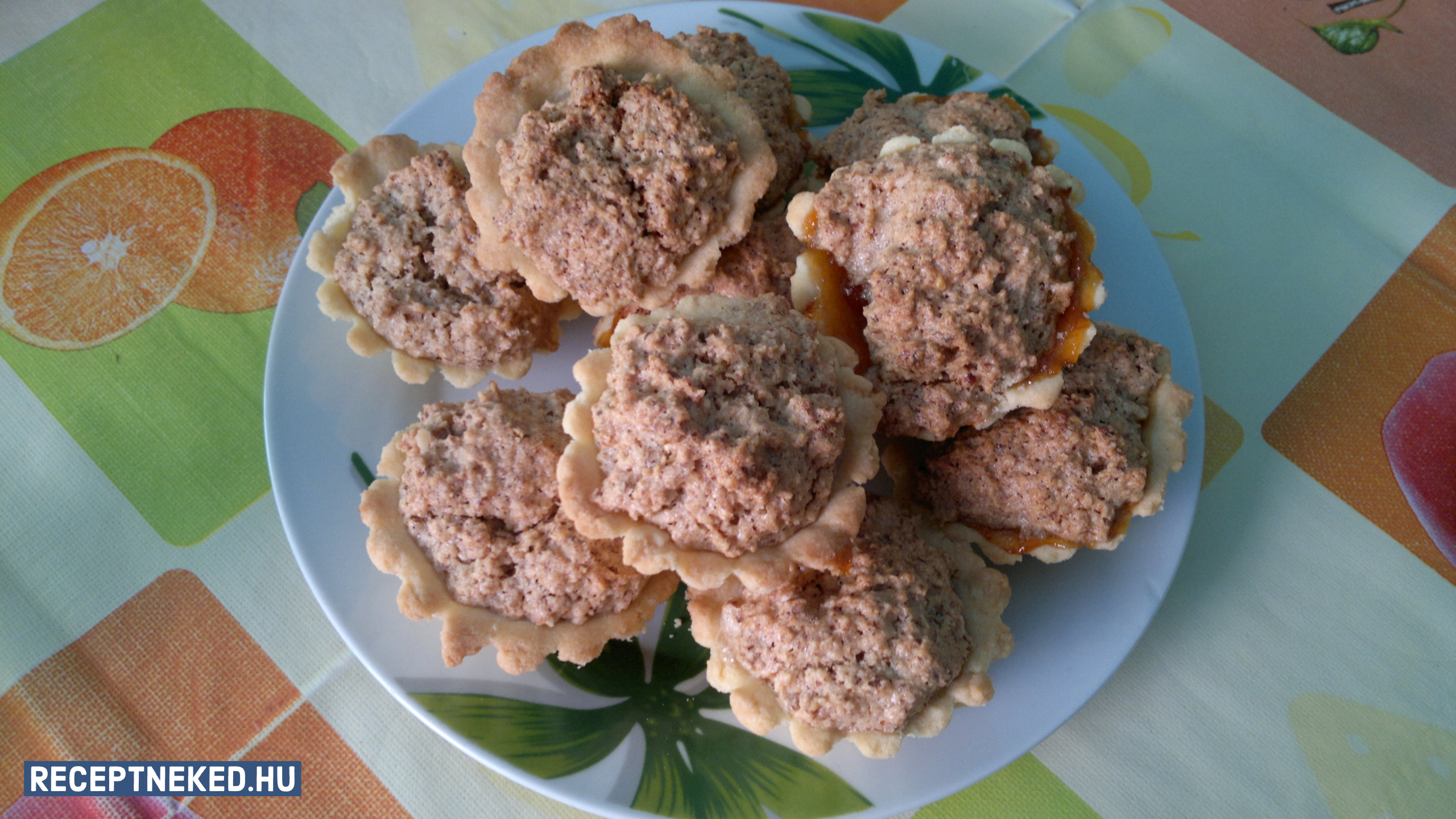 A sütőformákat béleljük ki a tésztával, az aljába tegyünk meggyet vagy lekvárt és erre kerül a diós hab.