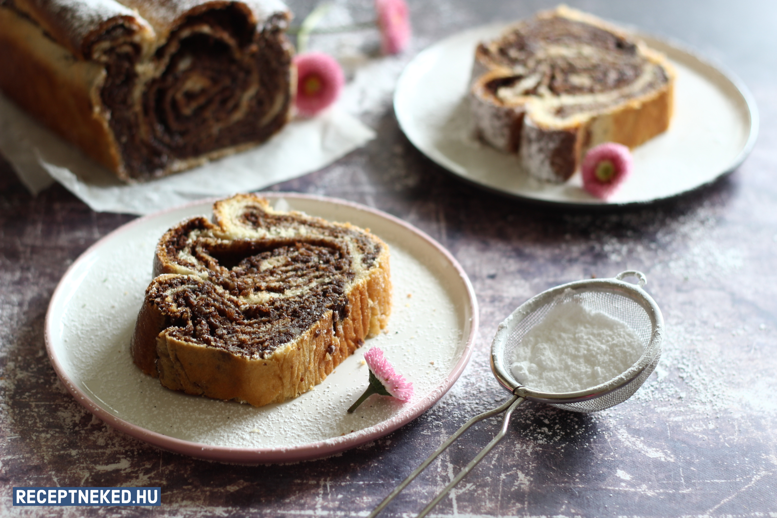 A tésztát tekerjük ki (ha fagyasztott, olvasszuk ki és nyújtsuk téglalap alakúra), kenjük meg az olvasztott margarinnal, oszlassuk el a tésztán a darált diót, majd a kétféle cukrot.