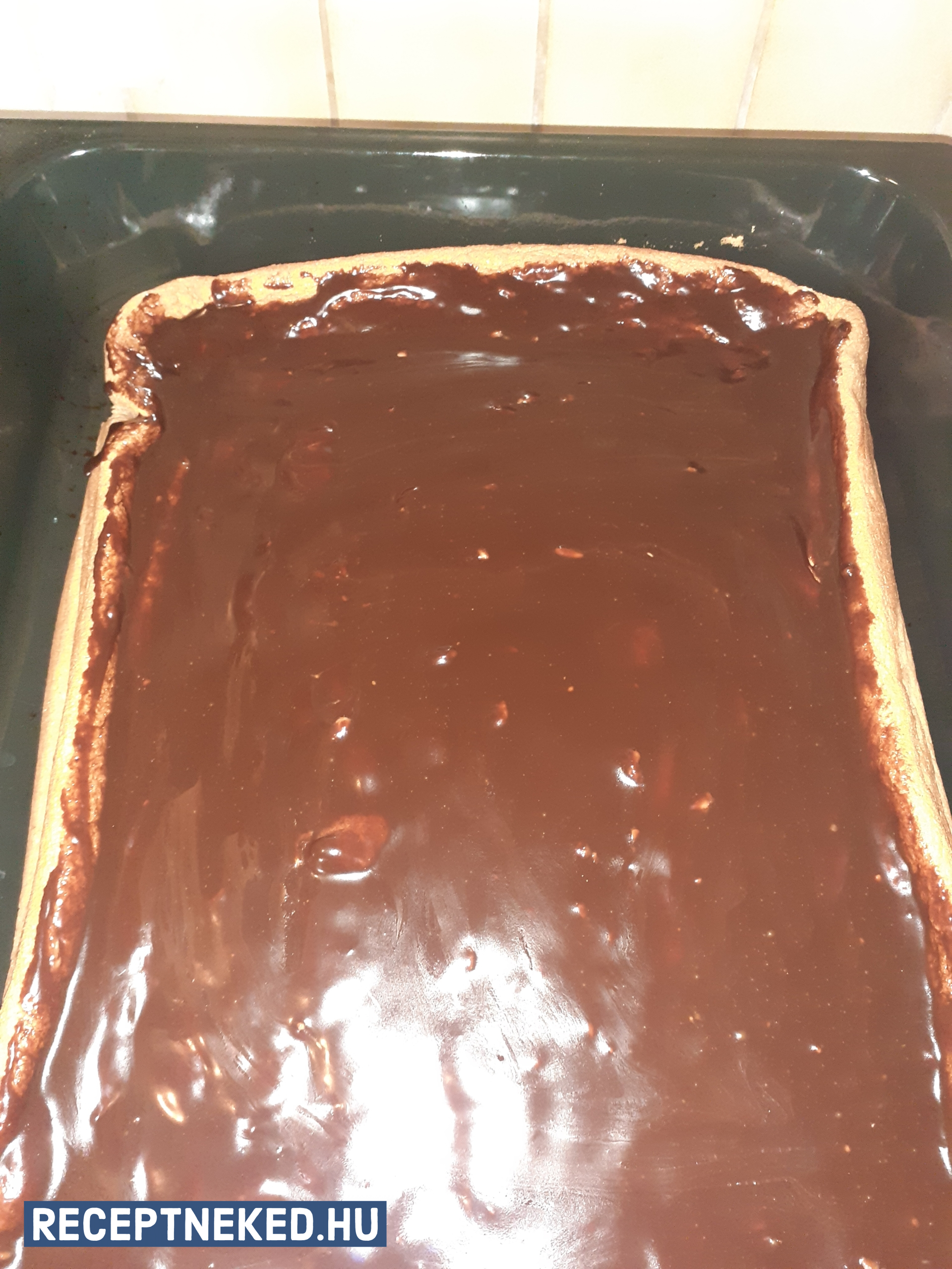 Egyenként kinyújtjuk 32*20 cm-es nagyságúra. A tepsit zsírozzuk, lisztezzük és az egyik tésztával kibéleljük.