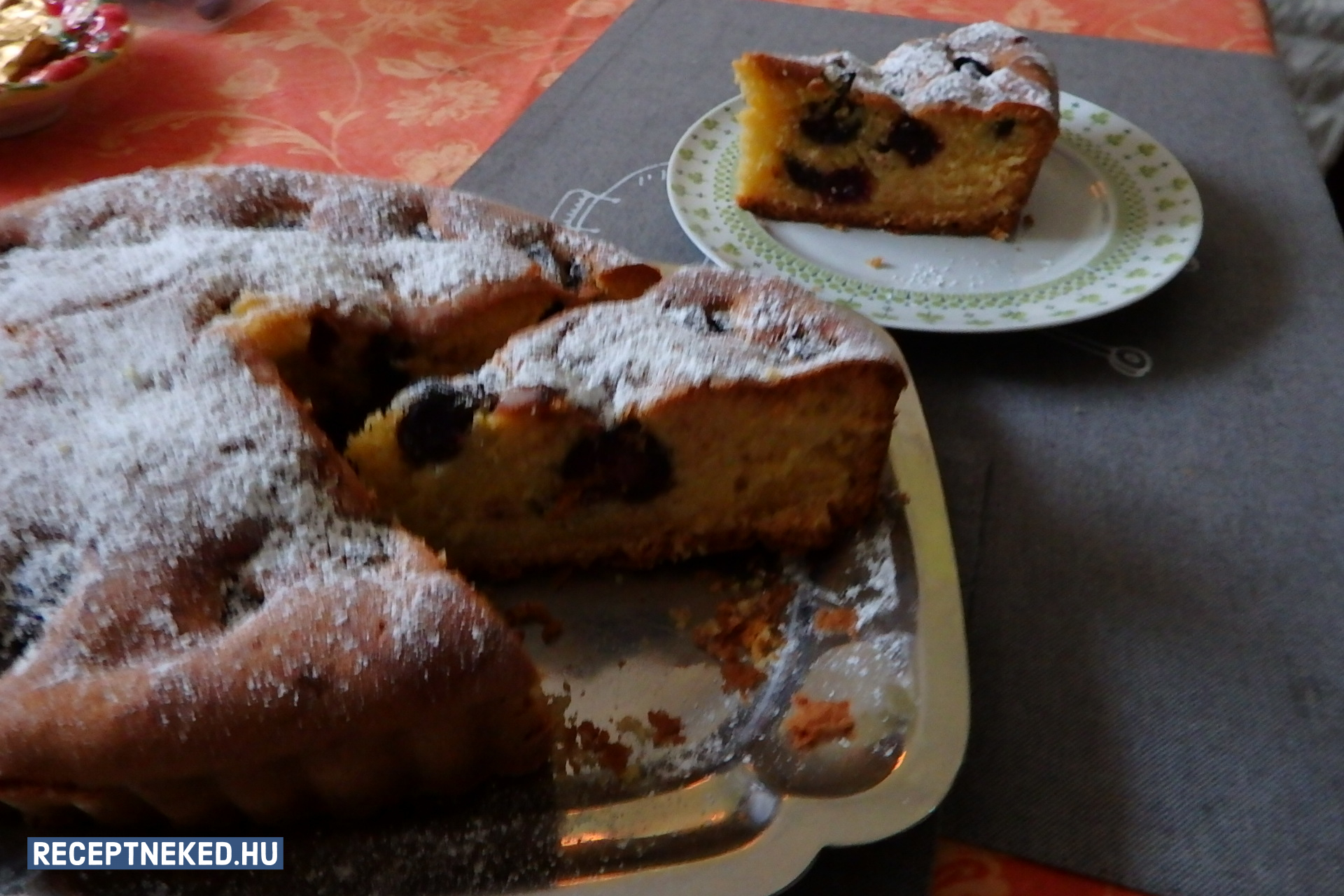 A meggyet lecsepegtetjük és hogy ne üljön le sütés közben teljesen a tepsi aljára, kevés zsemlemorzsába forgatjuk a meggyeket, majd ráhelyezzük a tészta tetejére. 170 C fokon, 30 percig sütjük.