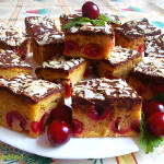 Egy 22 x 32 cm-es sütőlemezt sütőpapírral kibélelünk a masszát beleöntjük. A tetejét sűrűn meggyel beterítjük. Előmelegített sütőben készre sütjük.