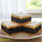 Az első tésztalapot tepsiméretűre nyújtjuk, majd sütőpapírral bélelt tepsibe fektetjük. Egyenletesen rákenjük a mákos tölteléket.