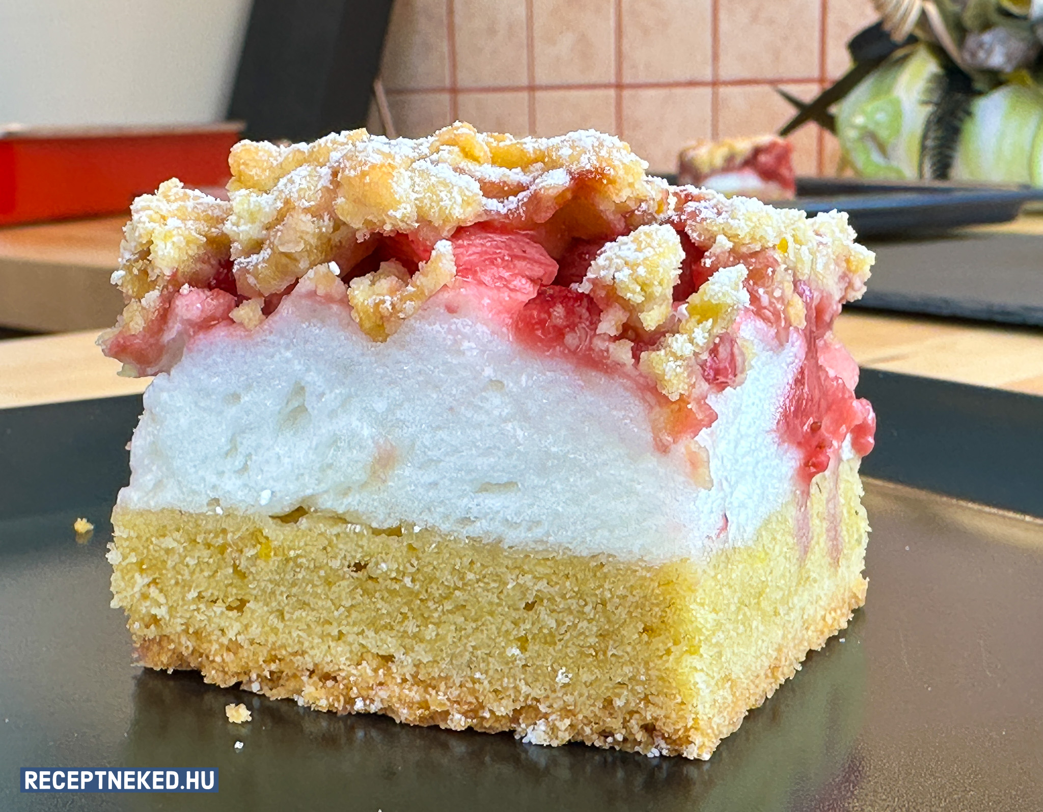 Mikor már majdnem kész a süti, a tojásfehérjéket kemény habbá verjük a cukorral, sóval és a citromlével. A tojáshabot rásimítjuk a sütemény tetejére, majs 150 fokon kb 20 percig szárítjuk.