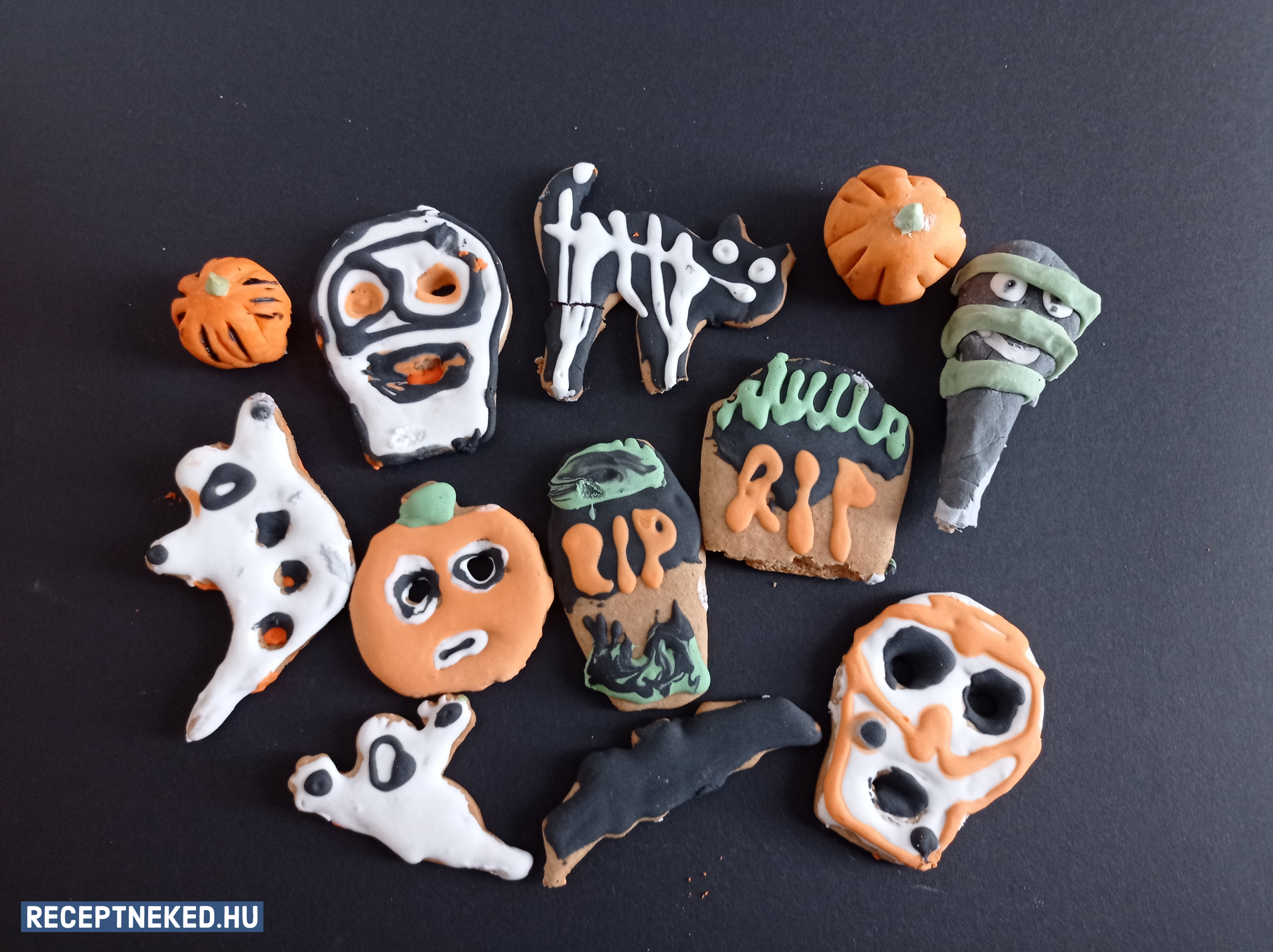 A maradék cukorral ízlés szerint díszítsük ki a házat. A rémisztő apró sütiket ízlés szerint díszítsük ki a cukormázzal.