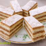 A lapokat betöltjük a krémmel. Akár le is súlyozhatjuk. Tegyünk a sütemény tetejére egy sütőpapírt, arra egy egyenes felületű tárgyat (nyújtódeszka vagy tálca) és arra pedig egyenletesen bontatlan cukrot vagy lisztet. Így hagyjuk másnapig.