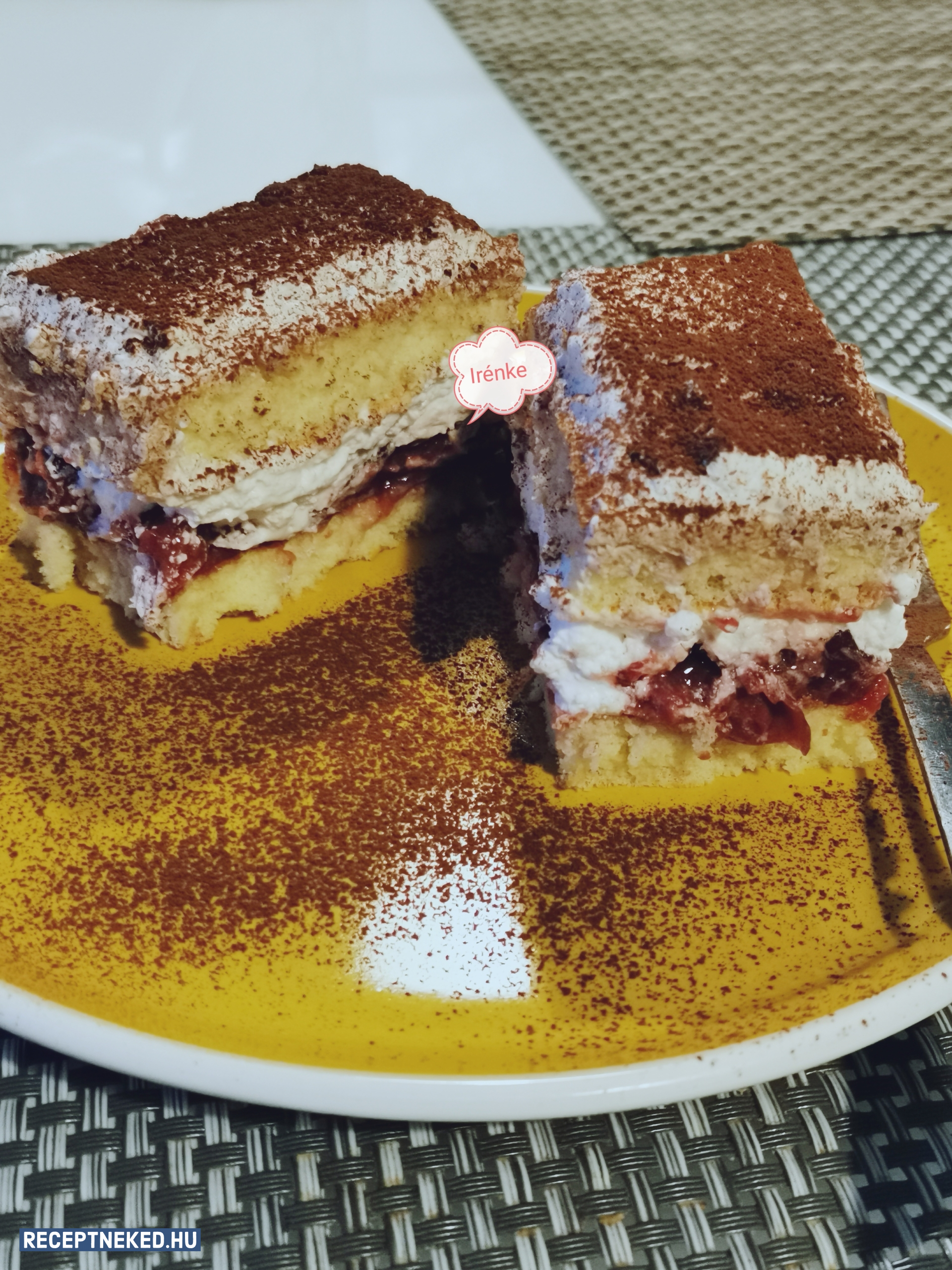 A meggyet kockára vágjuk, és a krémbe keverjük. Ez a krém, még langyosan kerül az alsó lapra.