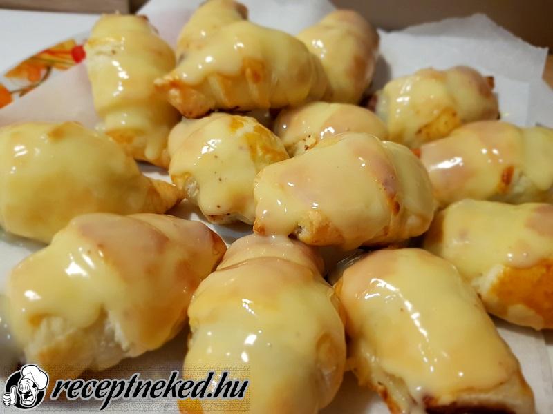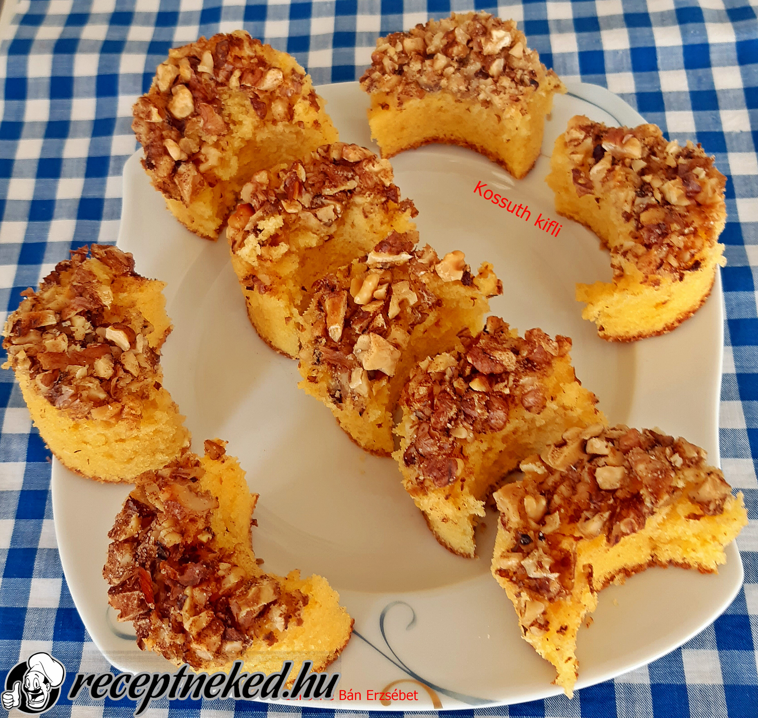 180 fokos sütőben kb. 30 perc alatt aranybarnára sütjük. Ha a sütemény kihűlt, egy pohárral kifliformákat szaggatunk belőle.