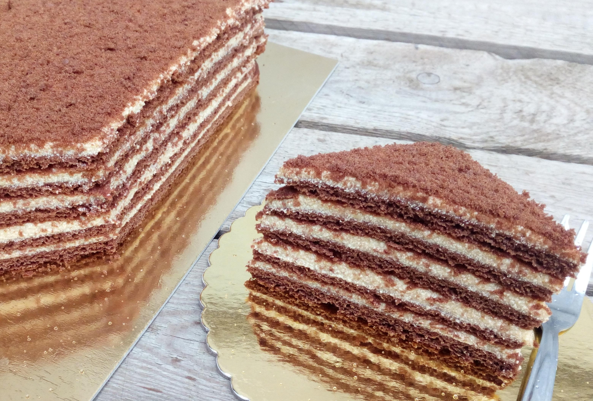 A lapokra rákenjük egyenlő arányban a krémet. A kész süti tetejére is kenünk vékonyan, majd megszórjuk darált dióval. Olvasztott csokit csurgathatunk rá, majd egy éjszakára hűtőbe tesszük vagy hűvös helyre.