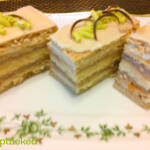 Mindegyik tésztát kb. 20×35 cm-es téglalappá nyújtjuk, és lisztezett tepsi hátulján, 180 °C-ra előmelegített sütőben 5–6 perc alatt aranyszínűre sütjük. A lapokat rácson hagyjuk teljesen kihűlni.