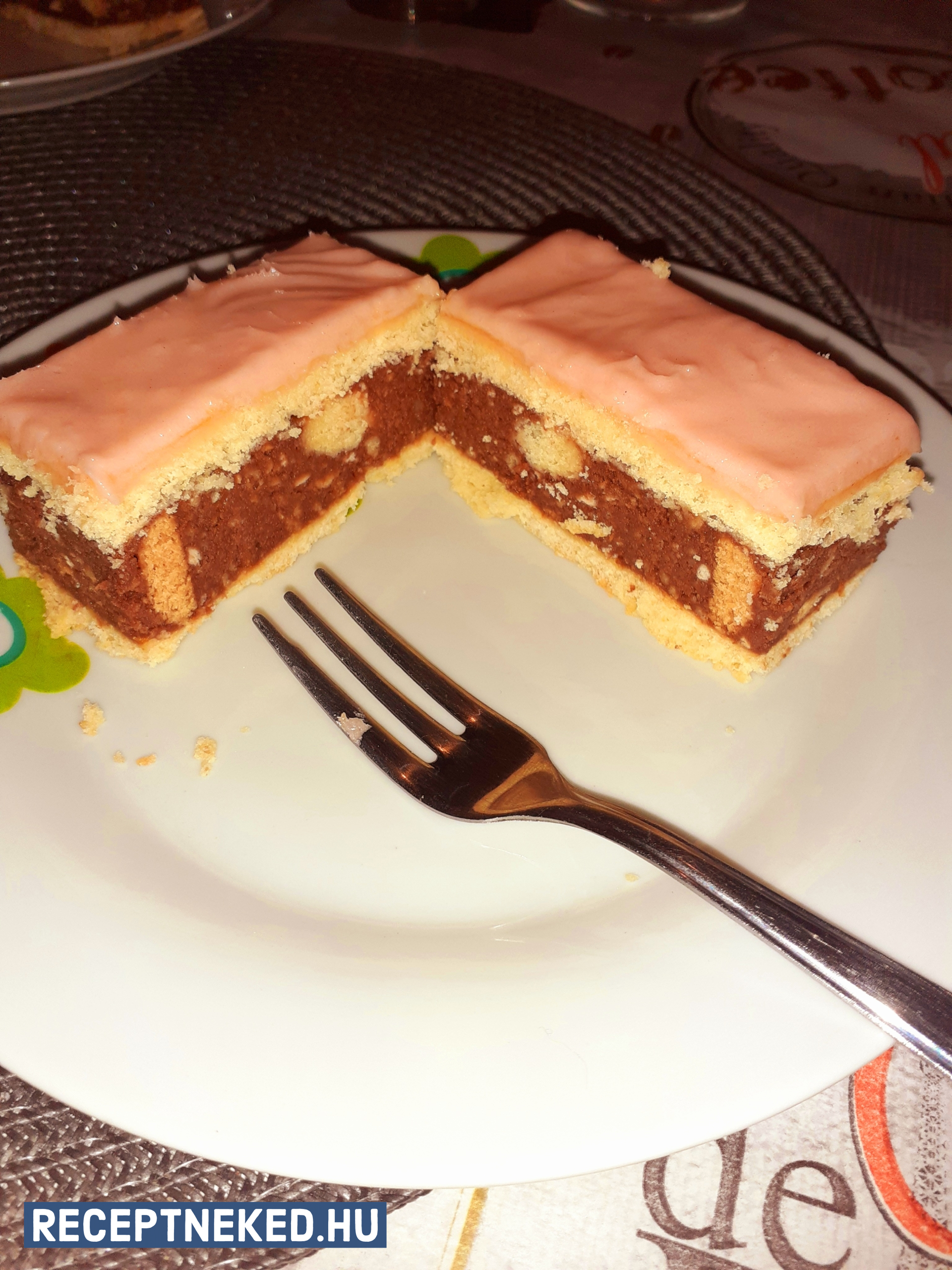 Belekeverjük az ételfestéket, annyit, hogy szép rózsaszín legyen. Bevonjuk a sütemény tetejét és hagyjuk dermedni.