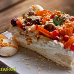 A rolád külsejét vékonyan körbekenjük tejszínhabbal, majd átfordítjuk a tepsibe, melyben a dió van. Most megkenjük az alját is tejszínhabbal és az egész roládot beleforgatjuk a dióba.