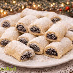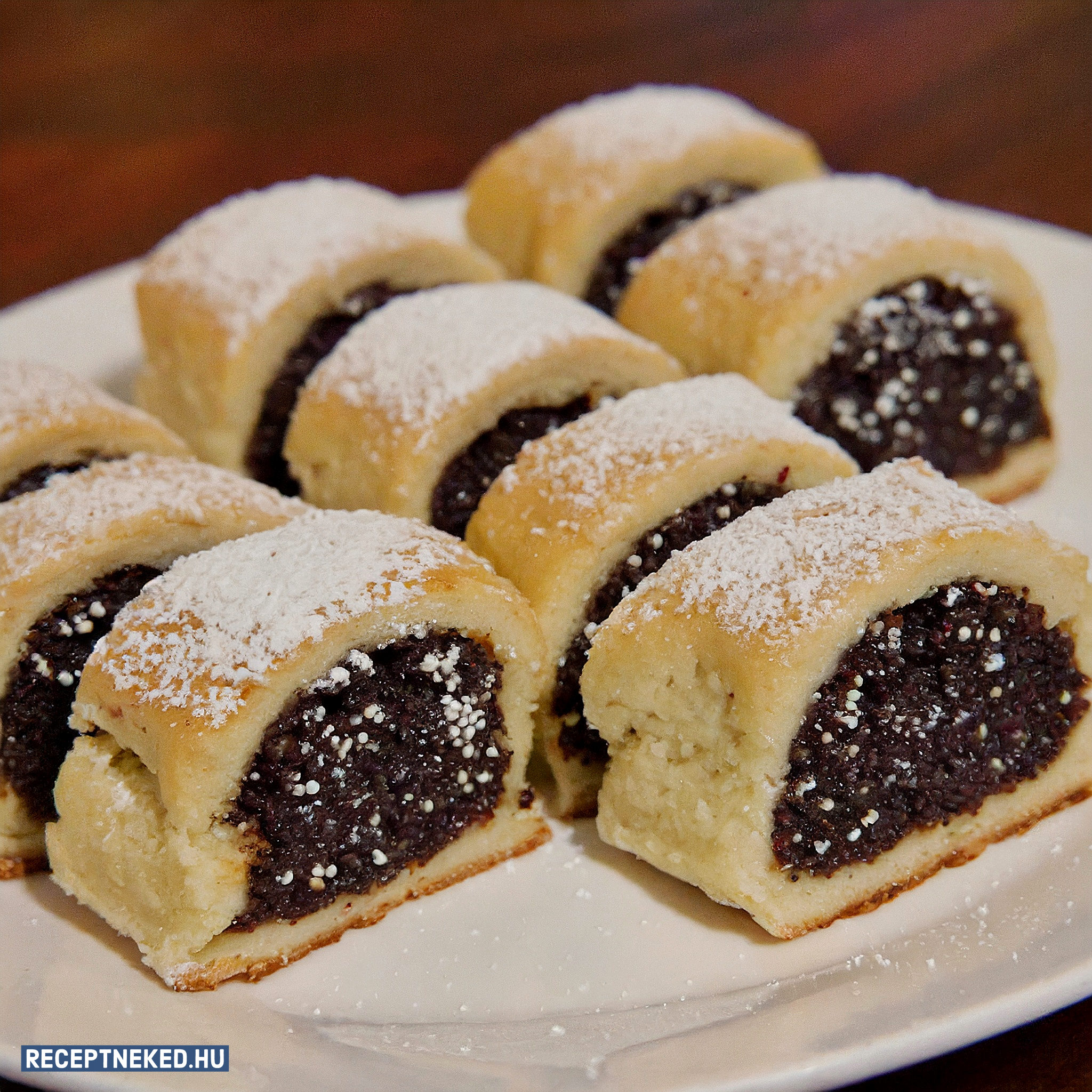 A visszadermedt tésztát lisztezett felületen kb. 28×32 cm-es téglalappá nyújtjuk, nagyjából 7 mm vastagságban. A kinyújtott tésztát 8×32 cm-es téglalapokra vágjuk. Mindegyik téglalap egyik szélére egy csíkban máktölteléket helyezünk.