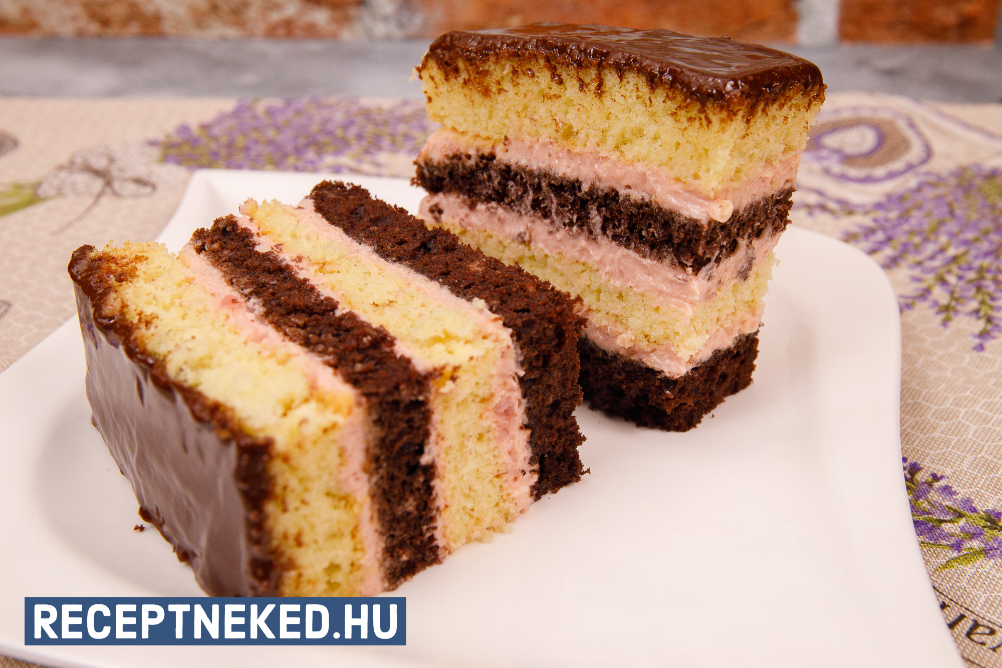A kakaós és a sima tésztát hosszában tetszőleges méretű szeletekre vágjuk, majd a krémmel összeragasztjuk őket. Egy kakaós, majd egy sima és így folytatjuk, amíg el nem fogynak a hozzávalók.