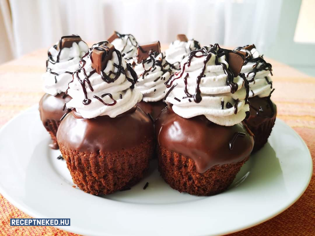 Közben a fehér csokoládét a tejszínnel felolvasztjuk és a muffinok tetejére csurgatjuk.