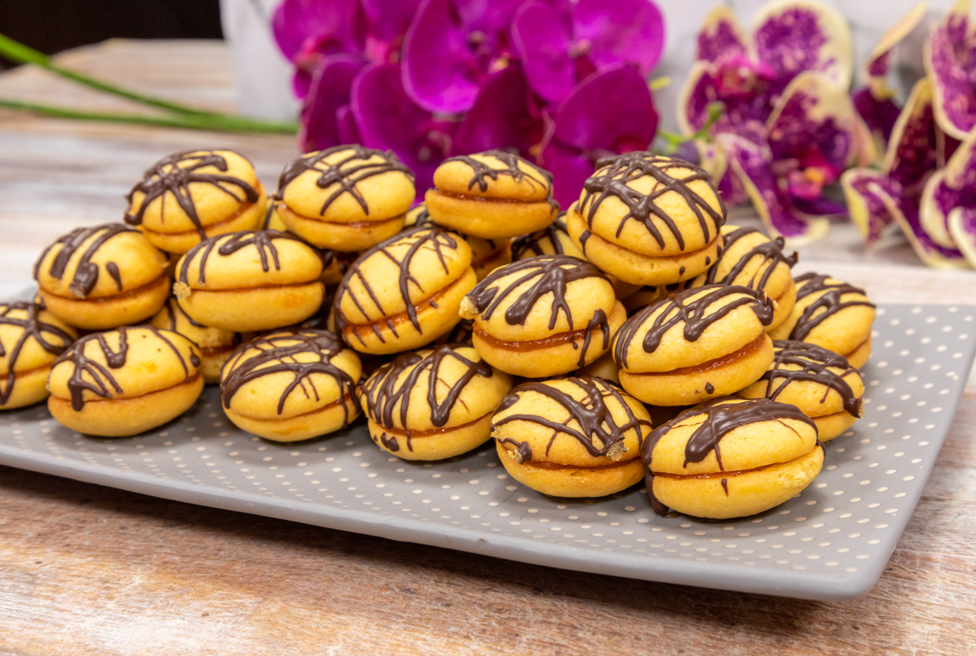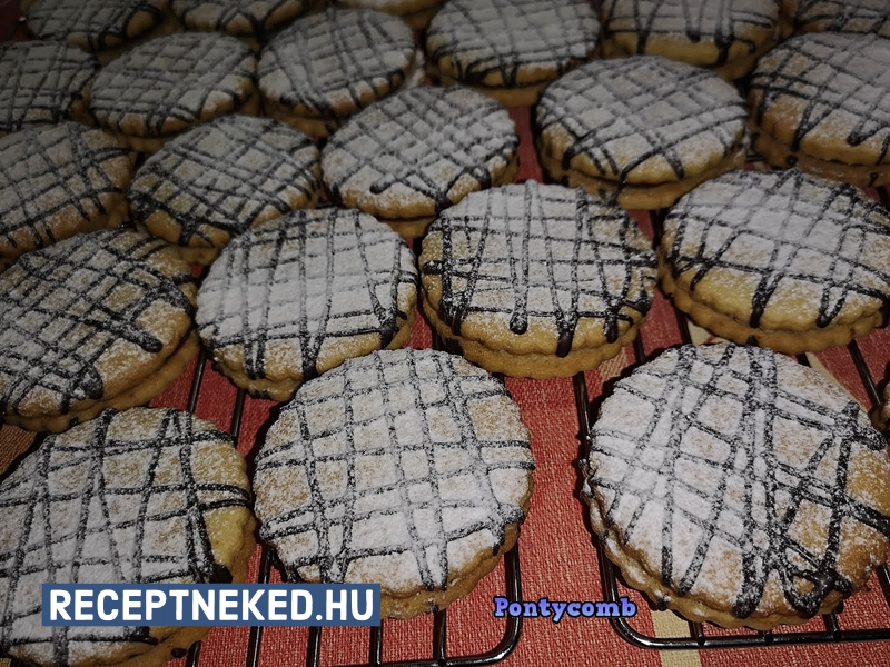 A kihűlt sütiket olvasztott csokival lecsorgatjuk, majd 1-1-et összeragasztunk lekvárral.