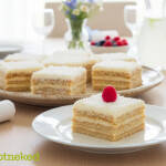 A még langyos krémet a tészta tetejére öntjük, elsimítjuk és megszórjuk kókuszreszelékkel.