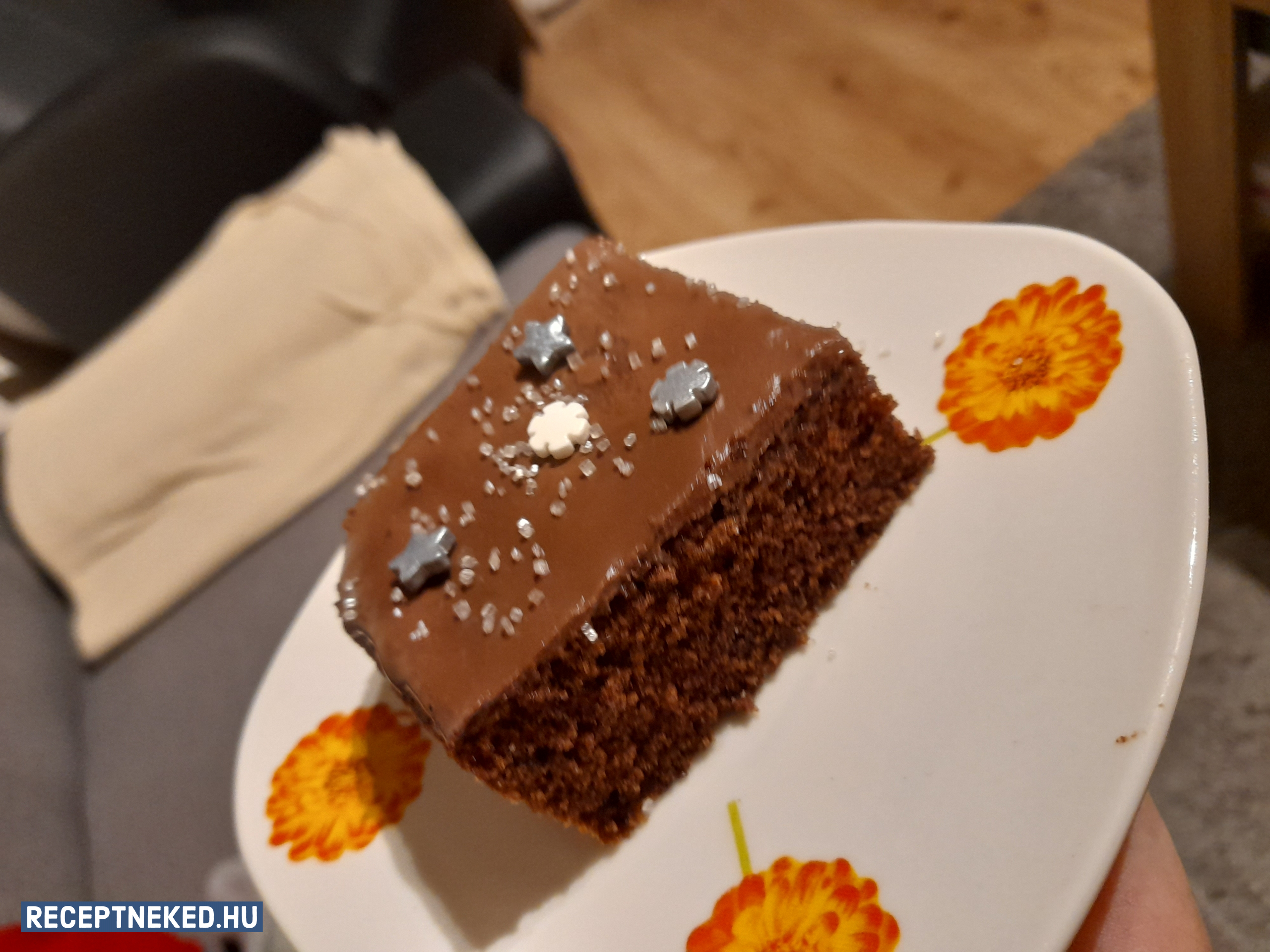 A tejszínt kemény habbá verem és rásimítom a krém tetejére. Tetejére a 4 kocka csokit megolvasztottam az olajjal és meglocsoltam vele a kész sütit.