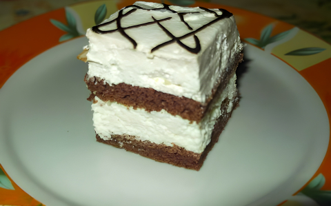 Az egyik piskótát megkenjük a krémmel, majd a másik piskótát rátesszük a tetejére. Tetejét tejszínhabbal és olvasztott csokival díszítjük.