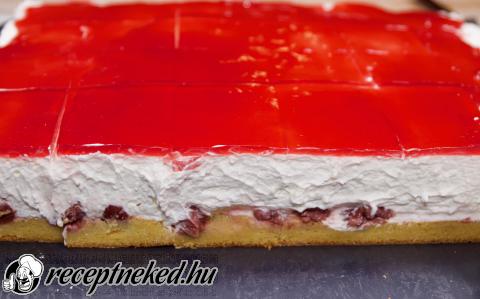 A tésztára kenjük rá egyenletesen a túrós krémet. A meggy levéből és a tortazseléből a csomagoláson található leírás alapján készítsünk piros zselét, majd langyosan öntük rá a sütire.
