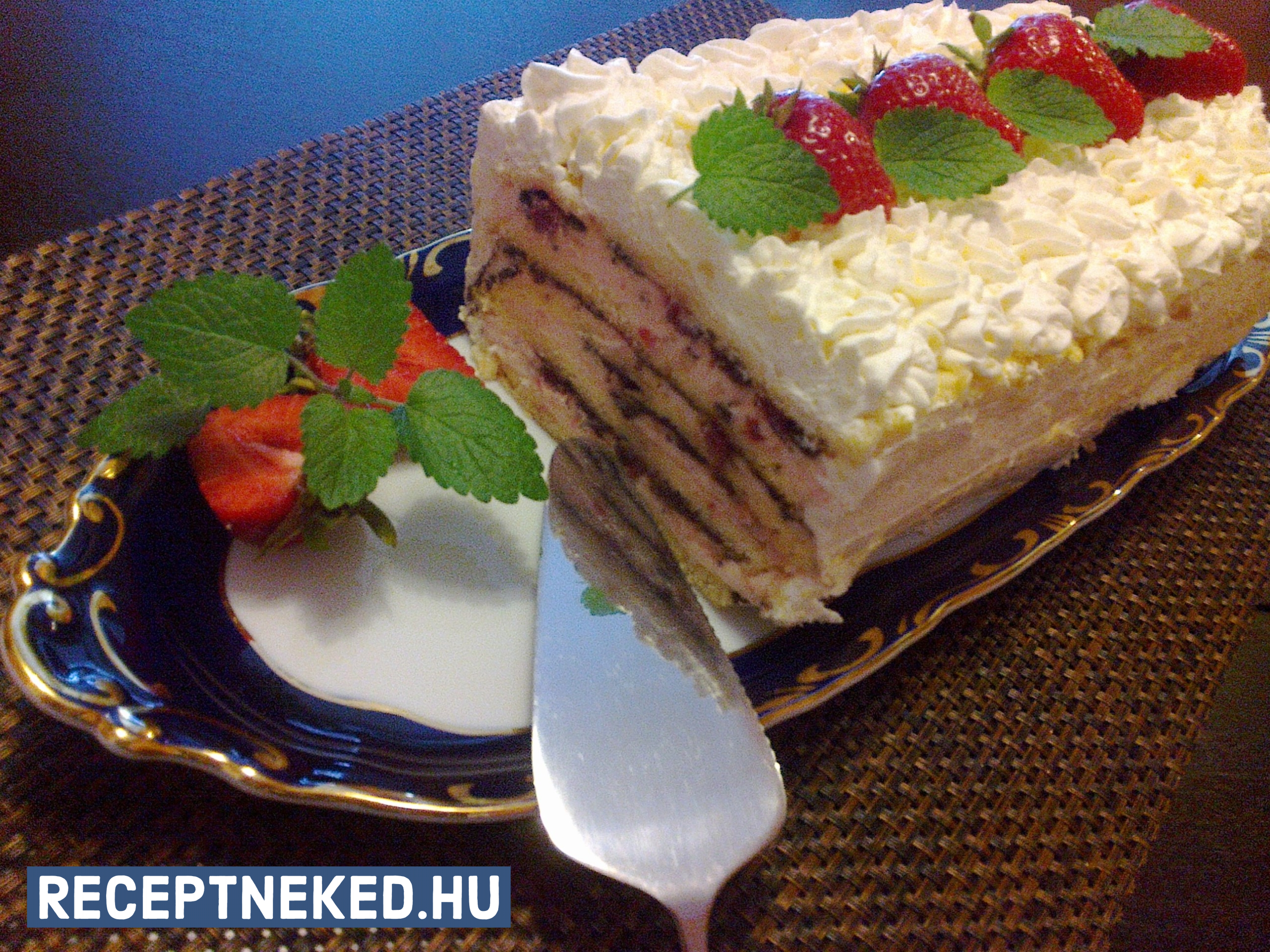Tetejét is bekenjük a krémmel és tetszőlegesen díszítjük. Pár órát vagy akár 1 napot hideg helyen tartjuk. Azután szeletelhetjük és kínálhatjuk.