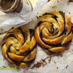 A leveles tésztát kitekerjük, majd 12,5 x 10 cm-es téglalapokra vágjuk, hogy 8 egyforma darabot kapjunk. Minden téglalap jobb oldalát három helyen bevágjuk, hogy sütés közben a gőz távozhasson. A nutellát habzsákba tesszük, és a tészta széleitől beljebb, egyenletesen megkenjük, nagyjából a tészta feléig érjen a csokis krém, mivel rá fogjuk hajtani a bevágott felét.
