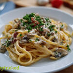 A hút fűszerezzük fok és vöröshagyma granulátummal, valamint sültcsirke fűszerrel. A bacont apróra vágjuk. A tésztát a szokásos módon kifőzzük, majd leszűrjük.
