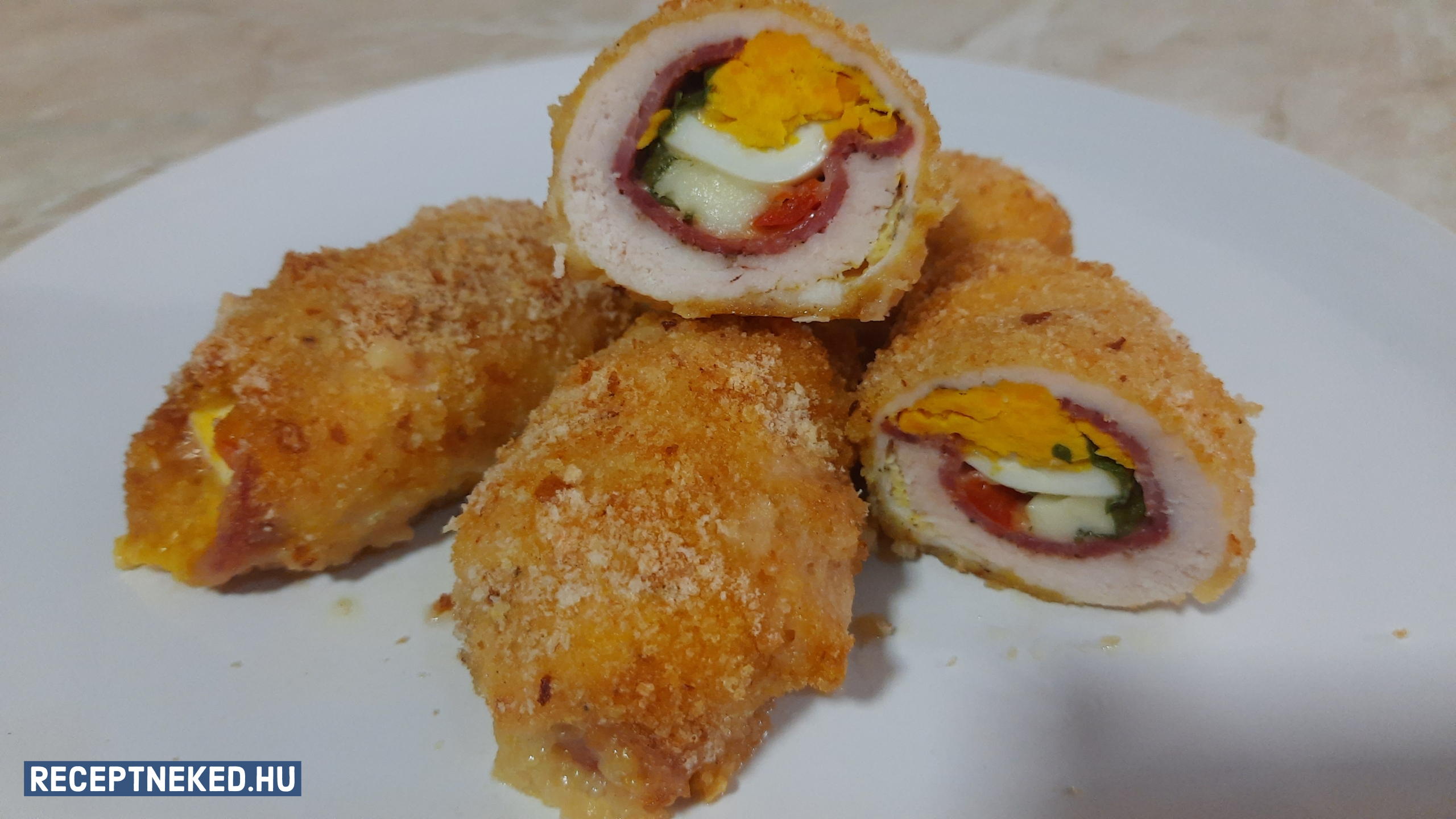 Óvatosan feltekerjük mint a piskótát (az alufóliát nem tekerjük közé, hanem alá nyúlva szépen hajtjuk), az alufóliával bevonjuk és betesszük sülni a 170 fokos sütőbe, pici vizet öntve alá. Mmikor félsülésben van, kb 35 perc után, rákenjük a tejfölt és visszatolva rózsaszínűre sütjük még kb 30 perc alatt.