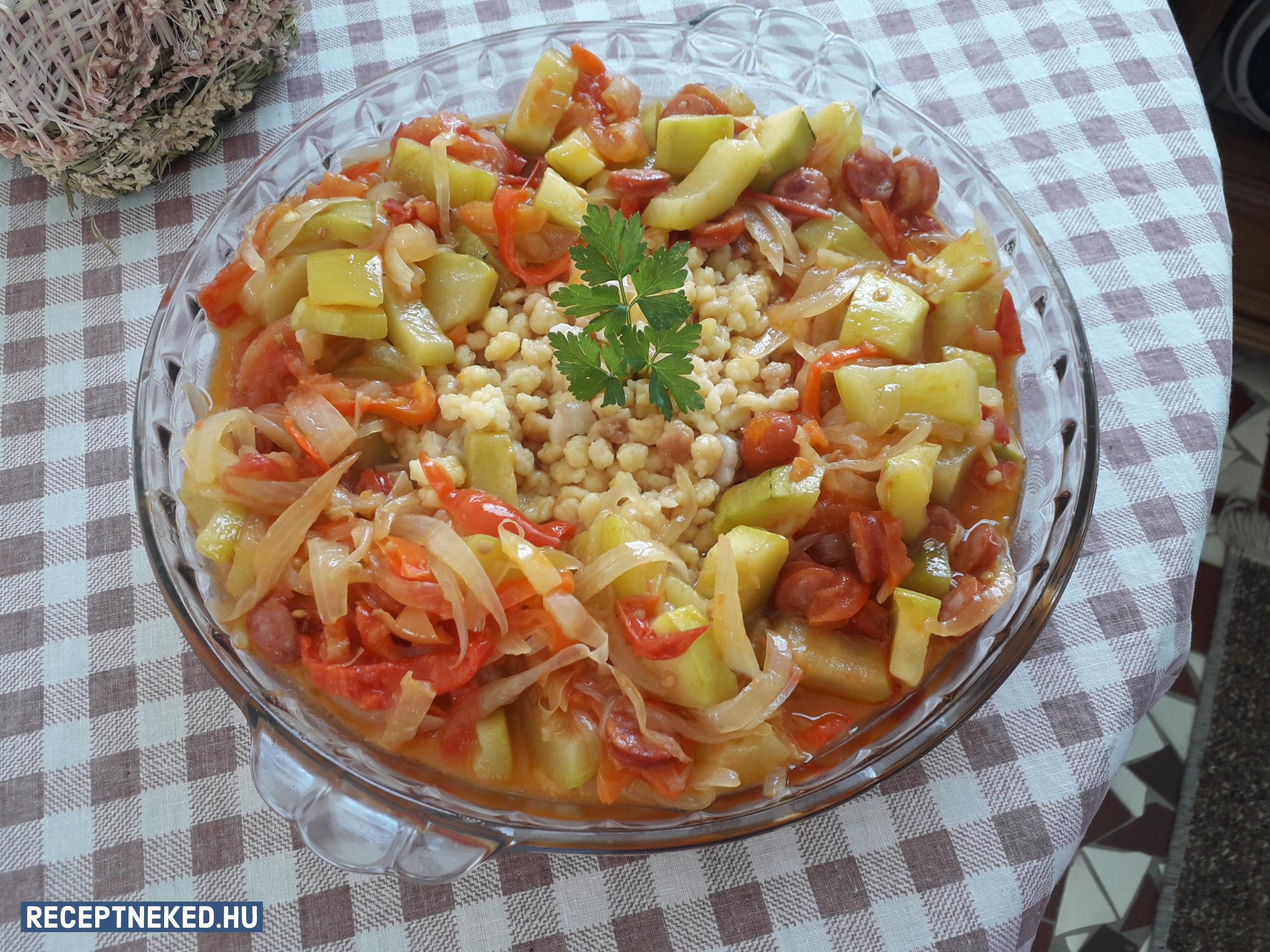 A tarhonyát a maradék olajon megpirítjuk, majd felöntjük 5 dl forró vízzel és lefedve puhára főzzük.