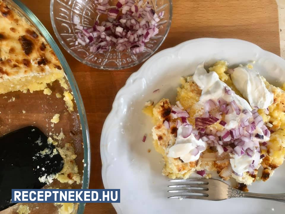 Ezután rétegezzük egy tűzálló tálba, (málé-szalonna-juhtúró, etc), diónyi zsírt teszünk a tetejére és 180 fokos sütőben 30 percig sütjük.