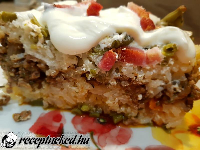 Egy pitetál aljára öntjük a húsos ragut, amit befedünk a burgonyapürével, végül a tetejét először megszórjuk zsemlemorzsával és reszelt sajttal.