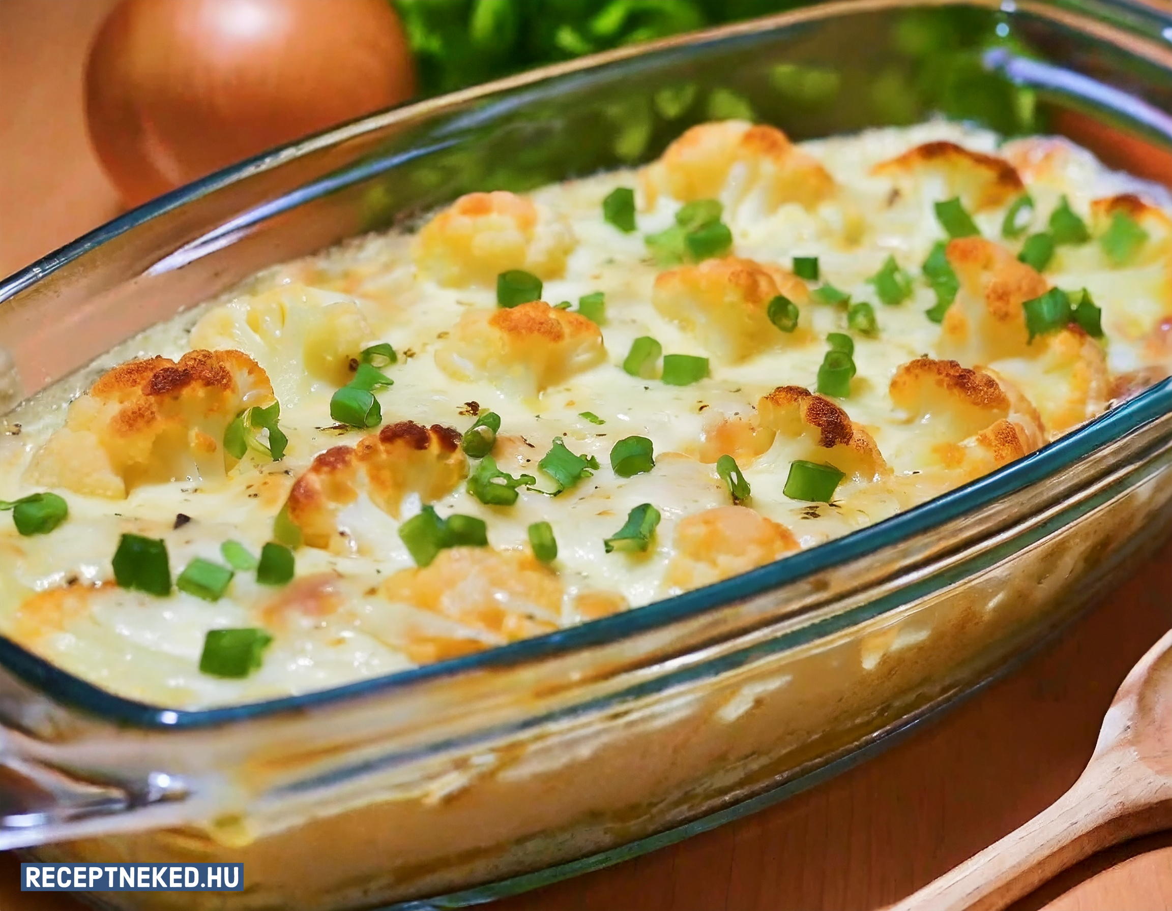 Az elkészült karfiolt szűrjük le, várjuk meg, míg hűl egy kicsit, majd a felét rendezzük egy jénai tál vagy tepsi aljára. A karfiolra terítsük rá a megfőtt rizst, majd a húsos ragut, végül a maradék karfiolt is helyezzük a tetejére.