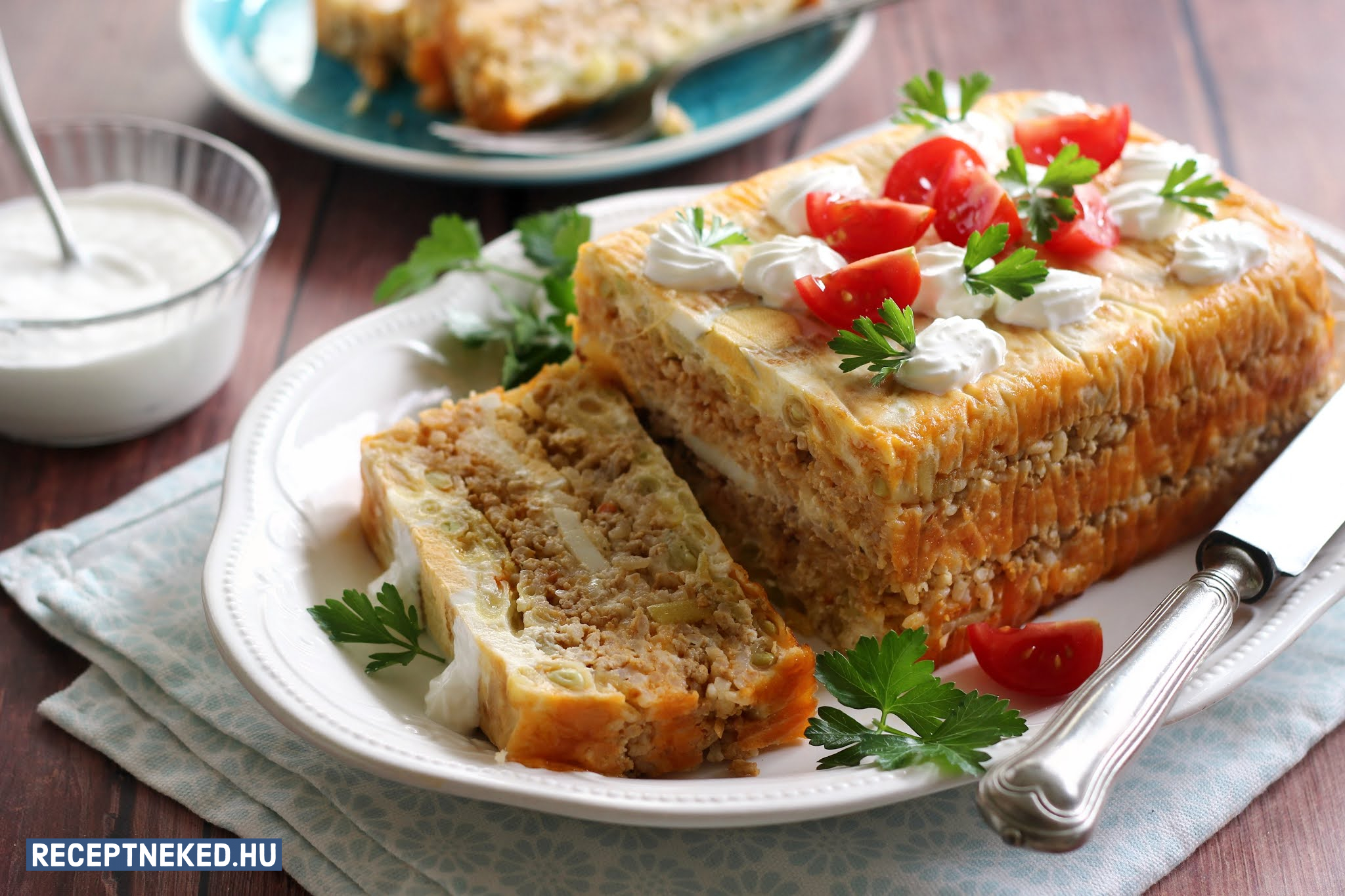 Addig rétegezzük, amíg a hozzávalók el nem fogynak. A végén tejföl és reszelt sajt kerül rá.