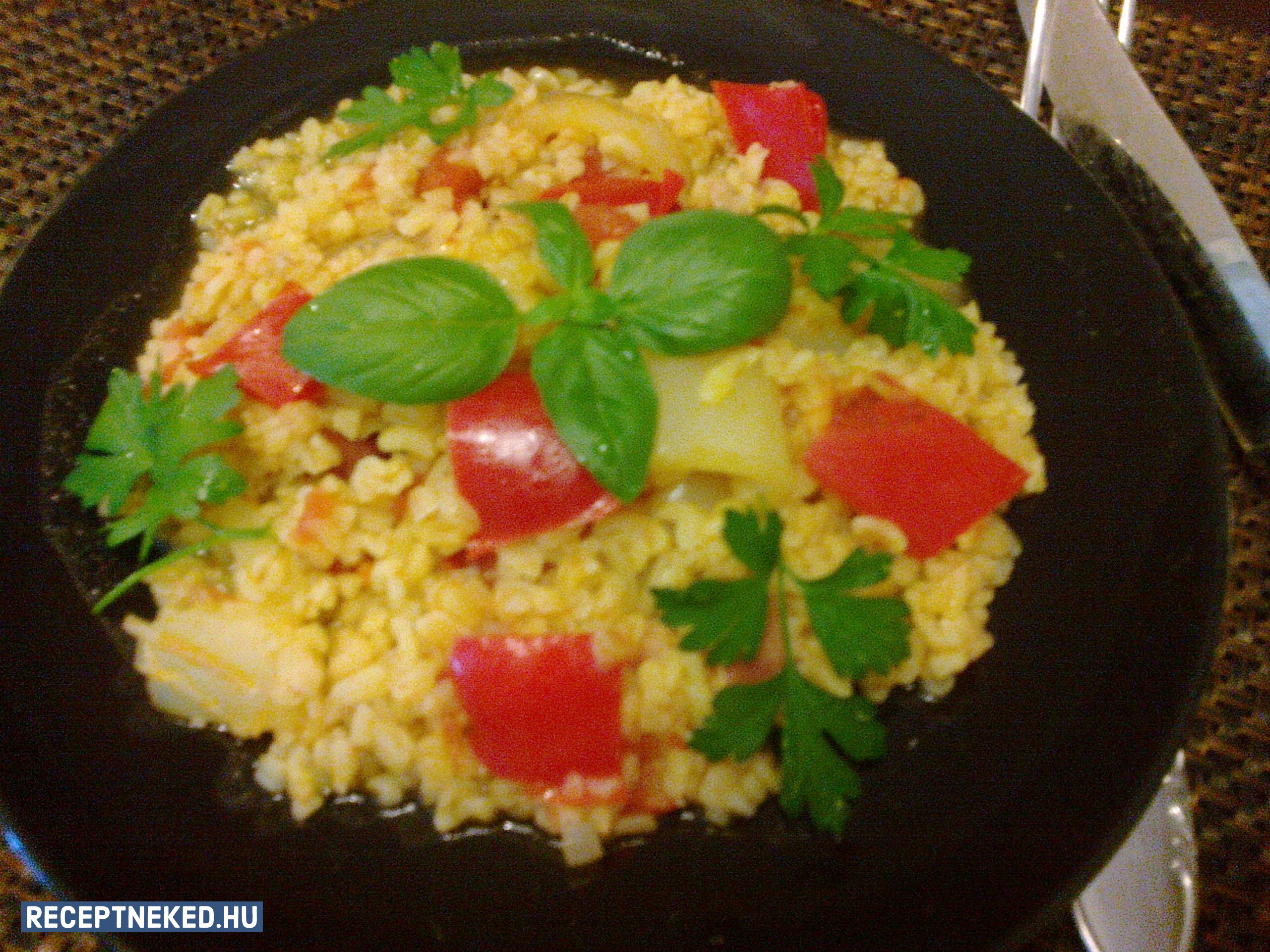 A felforrósított olajon megfonnyasztjuk a felaprított hagymát és a paprikát. Amikor összeesett, akkor hozzáadjuk a fokhagymát és kissé átpirítjuk.