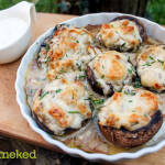 Amíg a hús készül, a gombafejekről eltávolítjuk a tönköket, majd a kalapokat megtisztítjuk. Sütőpapírral bélelt tepsire helyezzük őket.