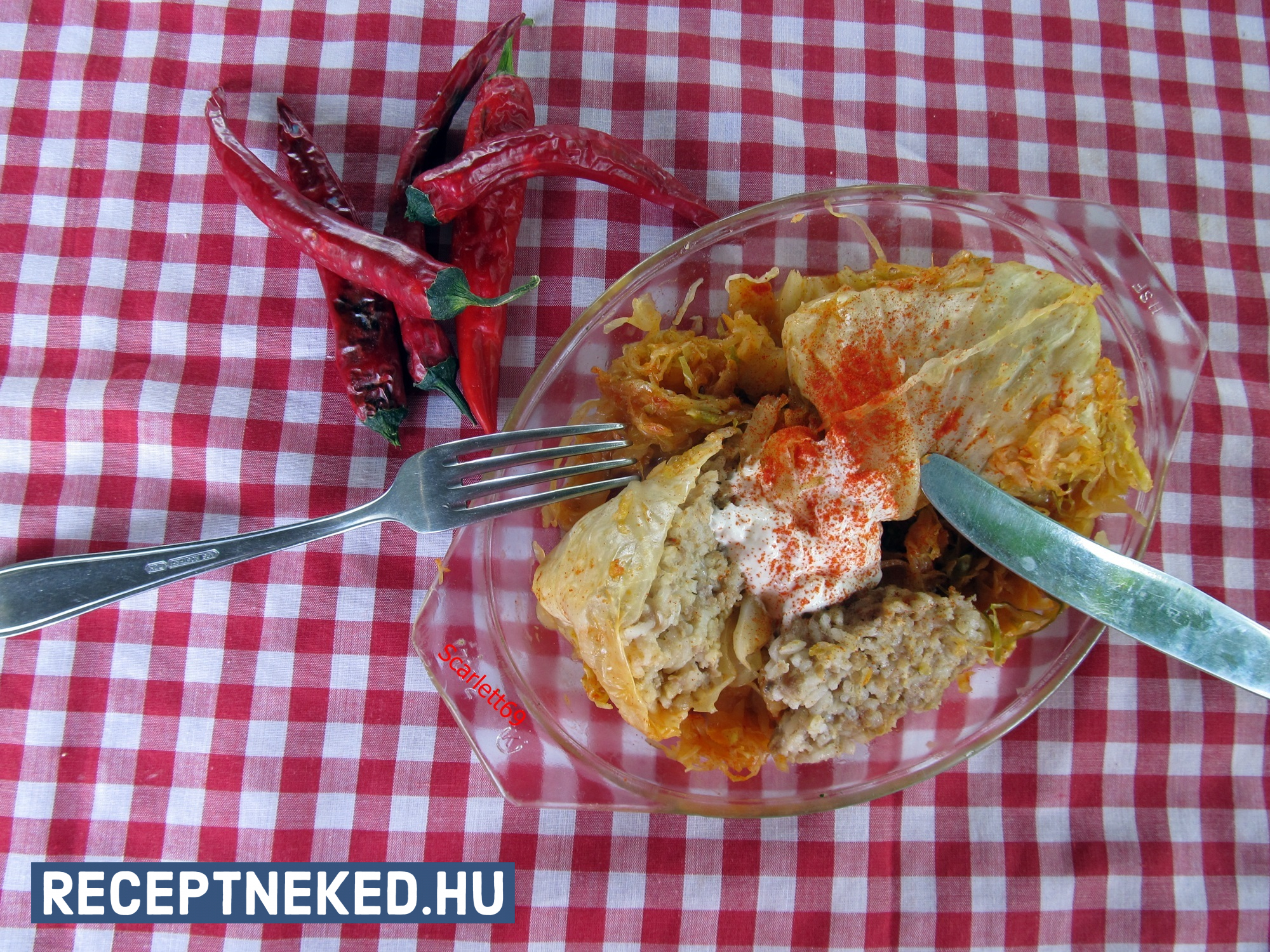 A vágott káposzta egyharmadát elterítettem a fazékban a dinsztelt hagymán. Rétegezni kezdtem a gombócokkal, majd soronként hintem pirospaprikával és borssal. Addig rétegezem, míg elfogy a hús és a levelek. Vágott káposztával zárom.