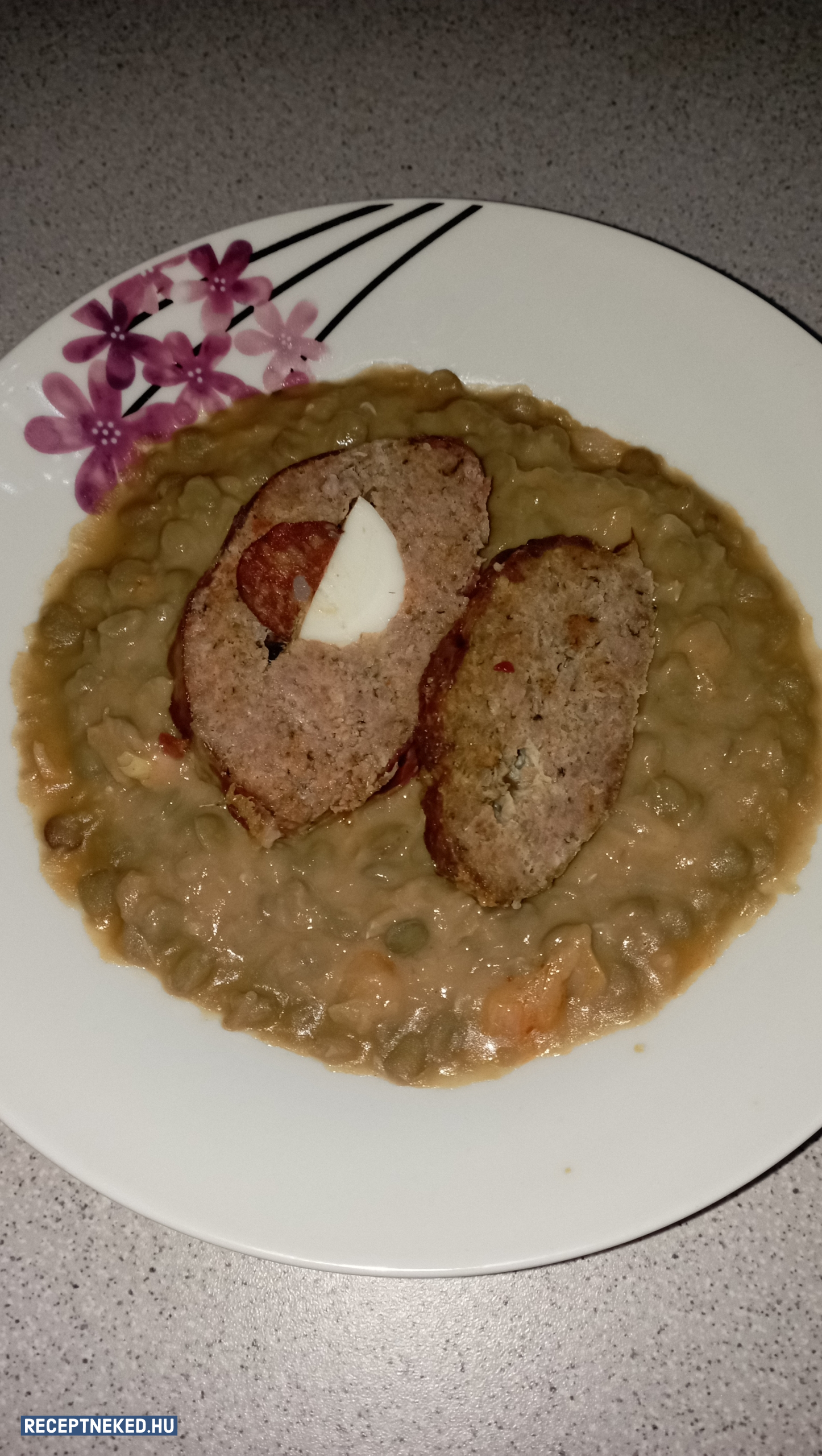 A füstölt szalonnát vagy sonkát megtűzdeljük szegfűszeggel és a lencsére ültetjük.