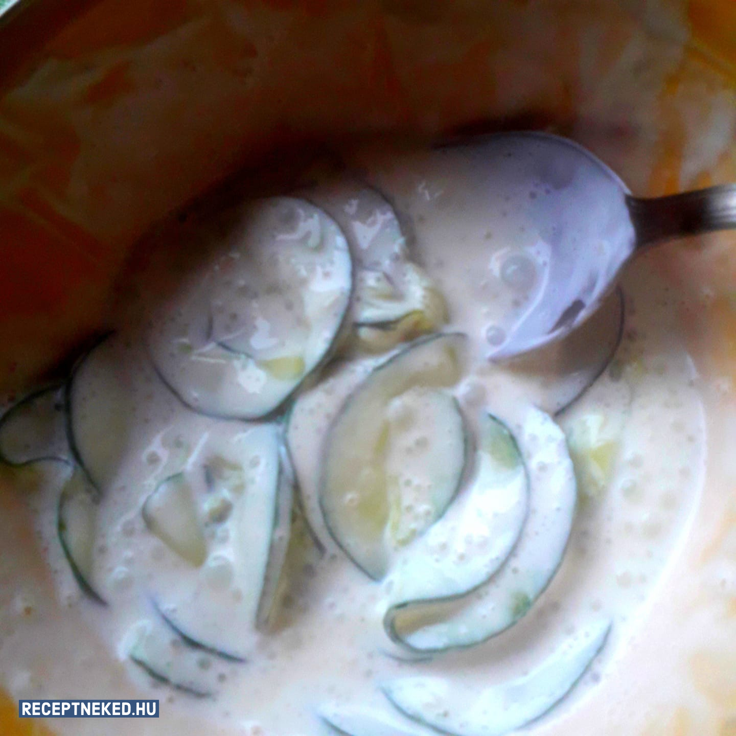 A fokhagymát préselve, a sót és az aprított petrezselyemzöldet is hozzádjuk.