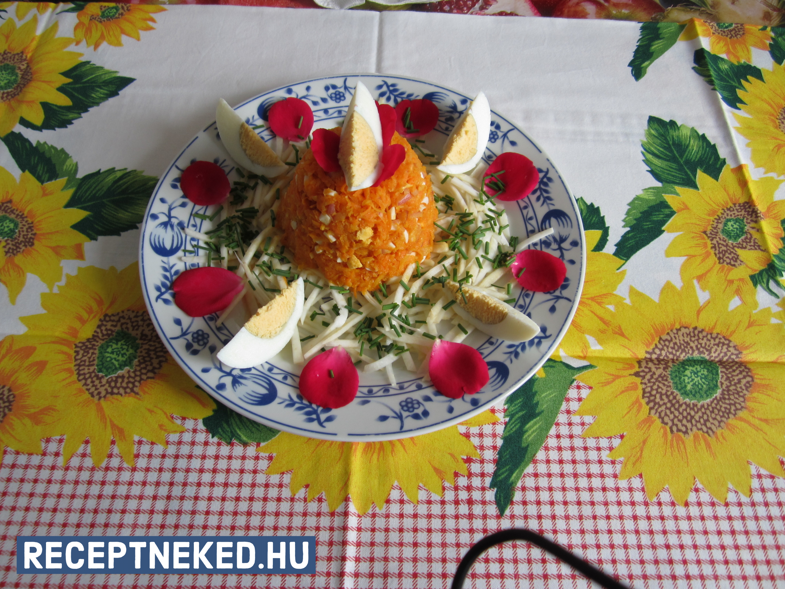 Ezalatt elkészítjük a salátánkat: a megmosott, leveleire szedett (esetleg apróbb darabokra tépkedett) salátát megsózzuk, kevés gyömbérrel megszórjuk, citrom levével meglocsoljuk.