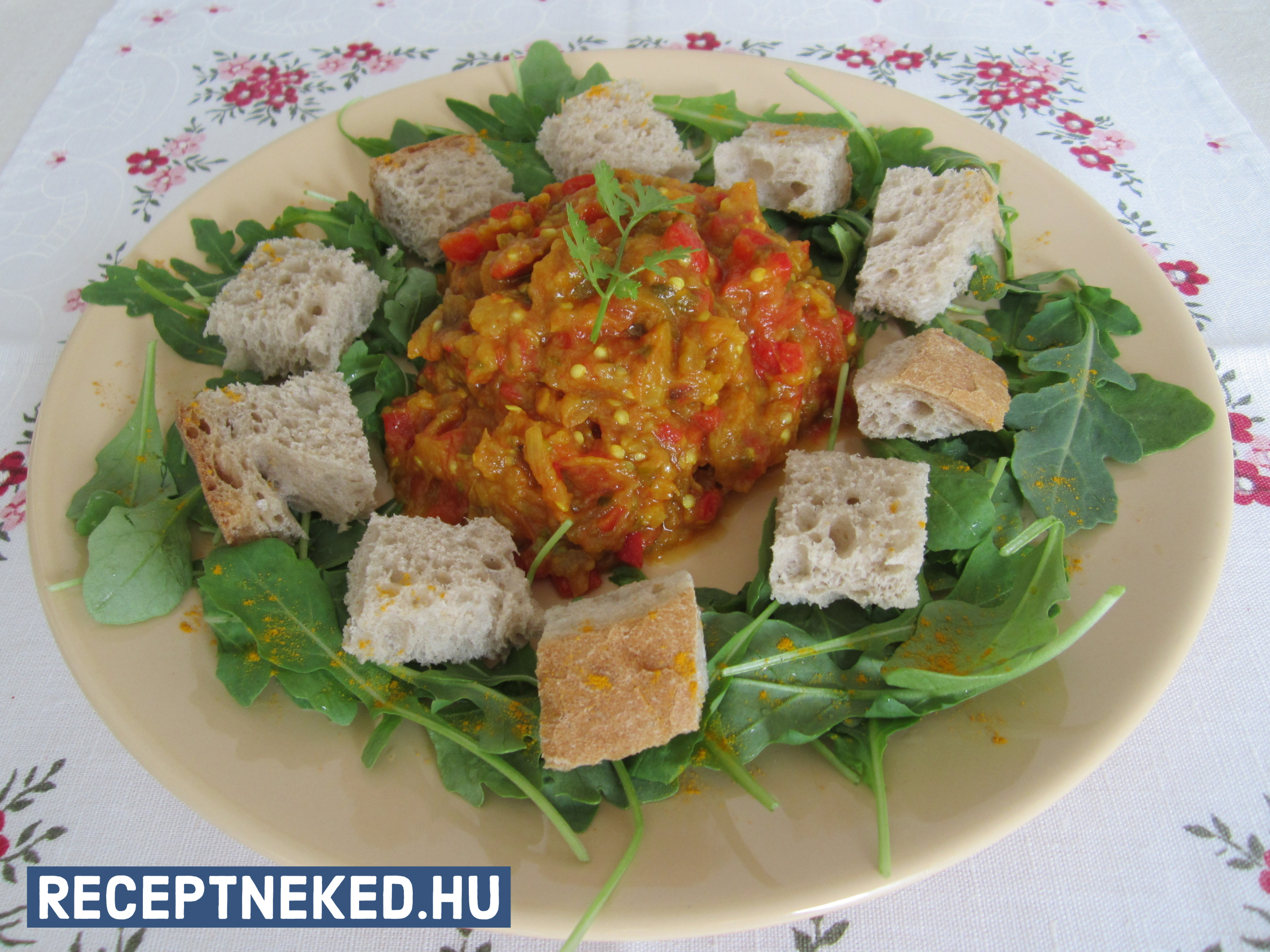 A megsült padlizsánról leszedjük a héját és fakanál segítségével összetörjük. Hozzáadjuk a hagymához, sózzuk, beleöntjük az olívaolajat és fakanállal eldolgozzuk. Lefedjük és legalább 30 percet a hűtőben érleljük.