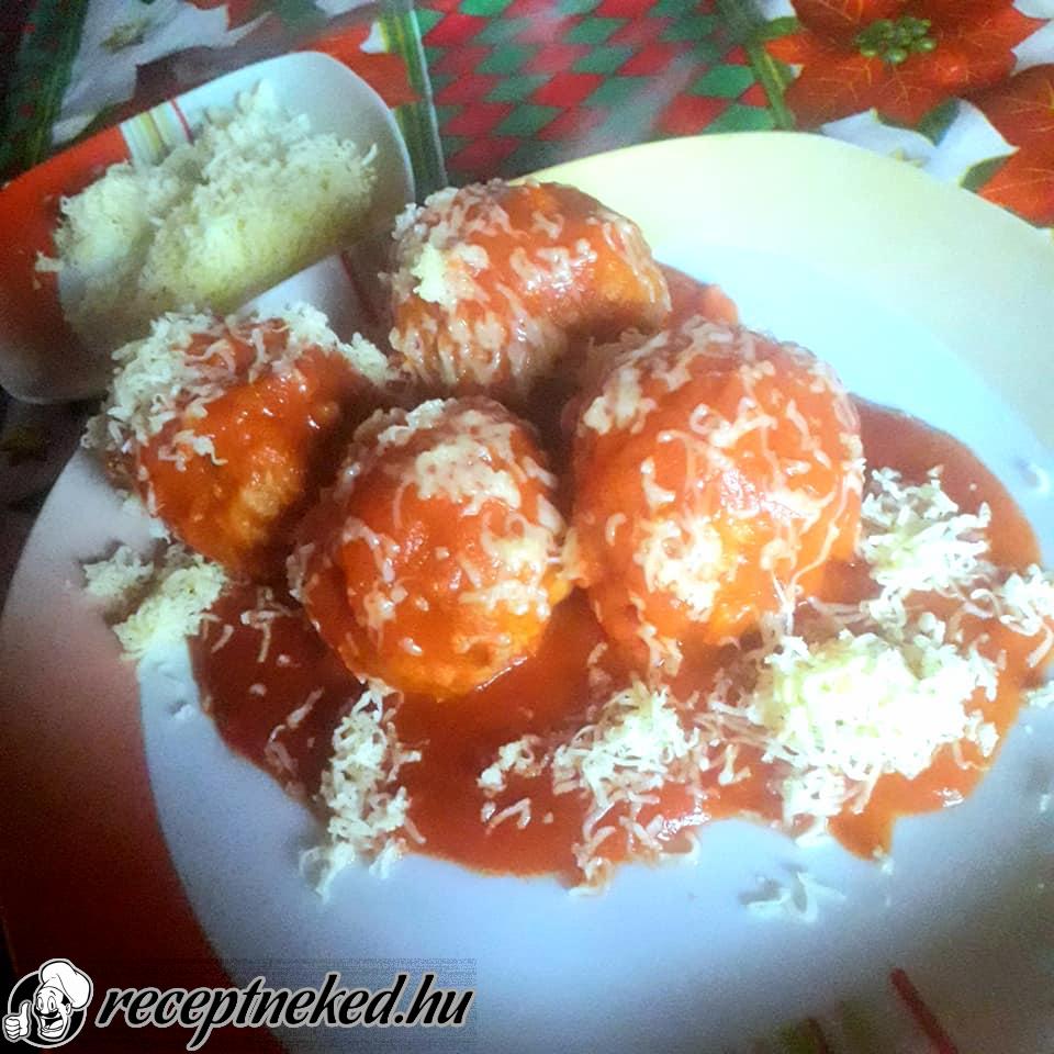 Egy tálban lazán felverjük a tojásokat, majd hozzákeverjük a darált húst, a pucolt és áttört fokhagymát, a zsemlemorzsát, a sót, a borsot és a fűszerpaprikát, majd az egészet jól összedolgozzuk.