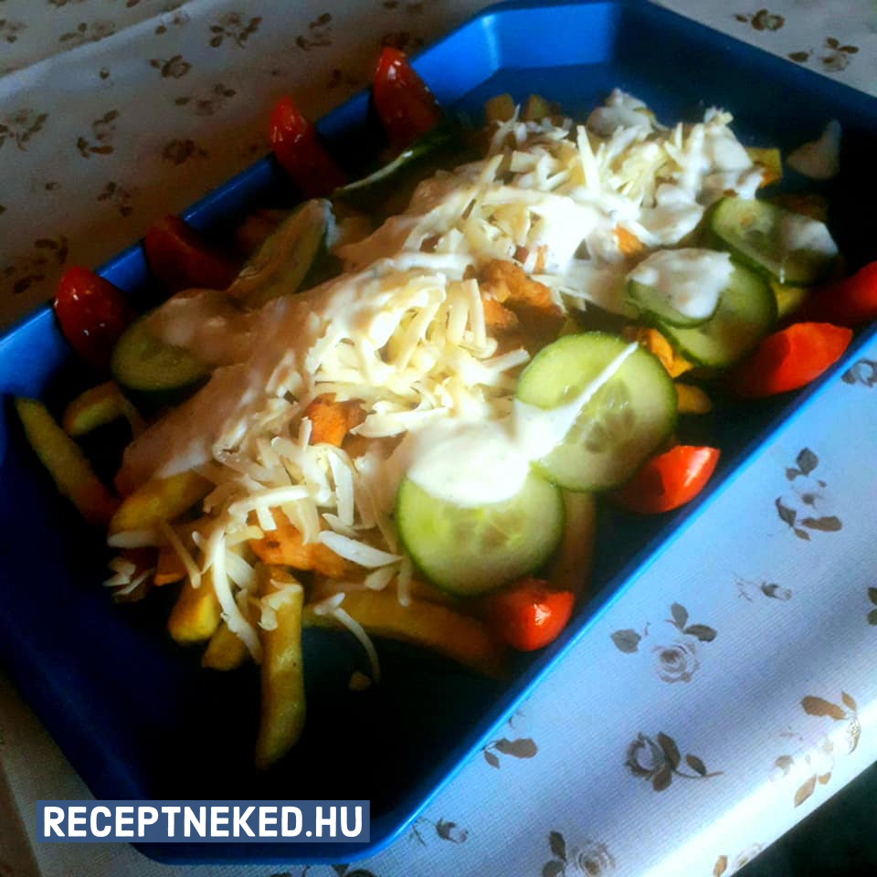 A tortilla lapokat egy palacsintasütőn átmelegítem, meglocsoljuk ketchuppal, majonézzel vagy fokhagyma dressingel (ki hogyan szereti), majd erre kanalazzuk a hagymás húst és a felaprított zöldséget és feltekerjük.